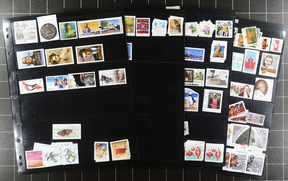 Large used collection of Canada 1859-2020, containing a few thousand stamps, neatly organized in roughly 55 double-sided Vario stock pages, housed in a thick binder. This collection has a little bit of everything including a few Small Queens, Jubilees, Leafs, Numerals, and continues with sets and partial sets of Edwards (full set), Quebecs (up to 7c), Admirals, Scrolls (up to 50c Bluenose), and complete sets of Arch, Pictorials, War and Peace issues. The collection continues with a good run of issues, including many modern used (8 double sided pages of post-2010 issues), along with a small selection of officials (perforated and overprinted), special delivery, revenues, and Newfoundland. A nice lot with duplication up to 10 for only a few issues. Online photos show a small sampling. Estimate =