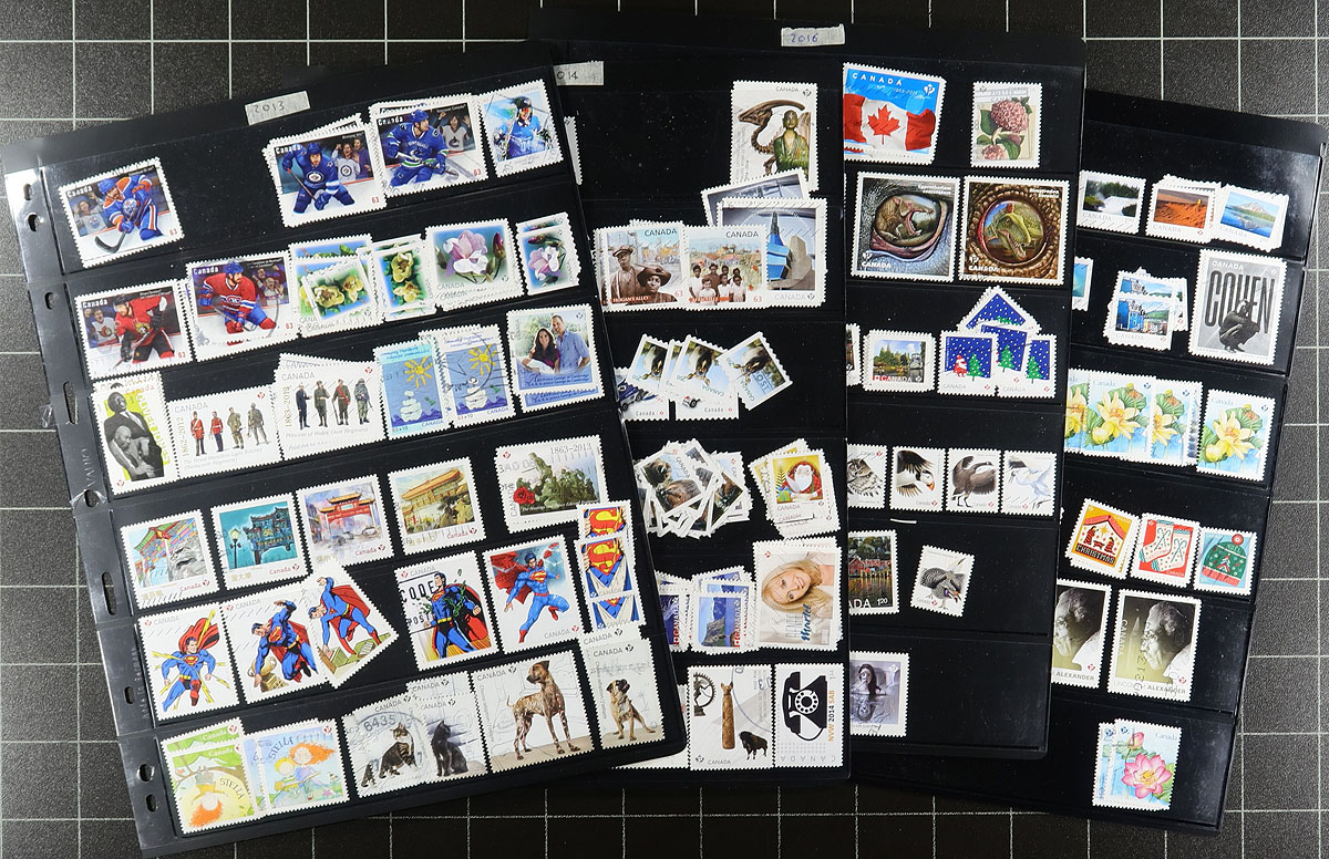 Large used collection of Canada 1859-2020, containing a few thousand stamps, neatly organized in roughly 55 double-sided Vario stock pages, housed in a thick binder. This collection has a little bit of everything including a few Small Queens, Jubilees, Leafs, Numerals, and continues with sets and partial sets of Edwards (full set), Quebecs (up to 7c), Admirals, Scrolls (up to 50c Bluenose), and complete sets of Arch, Pictorials, War and Peace issues. The collection continues with a good run of issues, including many modern used (8 double sided pages of post-2010 issues), along with a small selection of officials (perforated and overprinted), special delivery, revenues, and Newfoundland. A nice lot with duplication up to 10 for only a few issues. Online photos show a small sampling. Estimate =