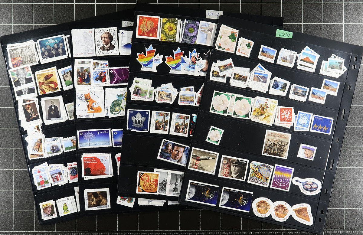 Large used collection of Canada 1859-2020, containing a few thousand stamps, neatly organized in roughly 55 double-sided Vario stock pages, housed in a thick binder. This collection has a little bit of everything including a few Small Queens, Jubilees, Leafs, Numerals, and continues with sets and partial sets of Edwards (full set), Quebecs (up to 7c), Admirals, Scrolls (up to 50c Bluenose), and complete sets of Arch, Pictorials, War and Peace issues. The collection continues with a good run of issues, including many modern used (8 double sided pages of post-2010 issues), along with a small selection of officials (perforated and overprinted), special delivery, revenues, and Newfoundland. A nice lot with duplication up to 10 for only a few issues. Online photos show a small sampling. Estimate =