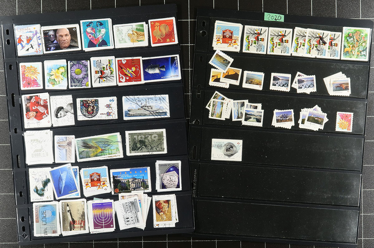 Large used collection of Canada 1859-2020, containing a few thousand stamps, neatly organized in roughly 55 double-sided Vario stock pages, housed in a thick binder. This collection has a little bit of everything including a few Small Queens, Jubilees, Leafs, Numerals, and continues with sets and partial sets of Edwards (full set), Quebecs (up to 7c), Admirals, Scrolls (up to 50c Bluenose), and complete sets of Arch, Pictorials, War and Peace issues. The collection continues with a good run of issues, including many modern used (8 double sided pages of post-2010 issues), along with a small selection of officials (perforated and overprinted), special delivery, revenues, and Newfoundland. A nice lot with duplication up to 10 for only a few issues. Online photos show a small sampling. Estimate =