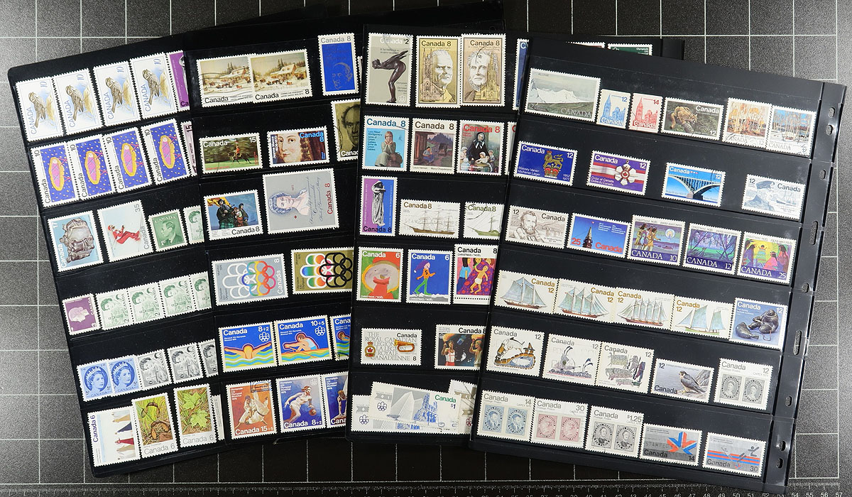 Large used collection of Canada 1859-2020, containing a few thousand stamps, neatly organized in roughly 55 double-sided Vario stock pages, housed in a thick binder. This collection has a little bit of everything including a few Small Queens, Jubilees, Leafs, Numerals, and continues with sets and partial sets of Edwards (full set), Quebecs (up to 7c), Admirals, Scrolls (up to 50c Bluenose), and complete sets of Arch, Pictorials, War and Peace issues. The collection continues with a good run of issues, including many modern used (8 double sided pages of post-2010 issues), along with a small selection of officials (perforated and overprinted), special delivery, revenues, and Newfoundland. A nice lot with duplication up to 10 for only a few issues. Online photos show a small sampling. Estimate =