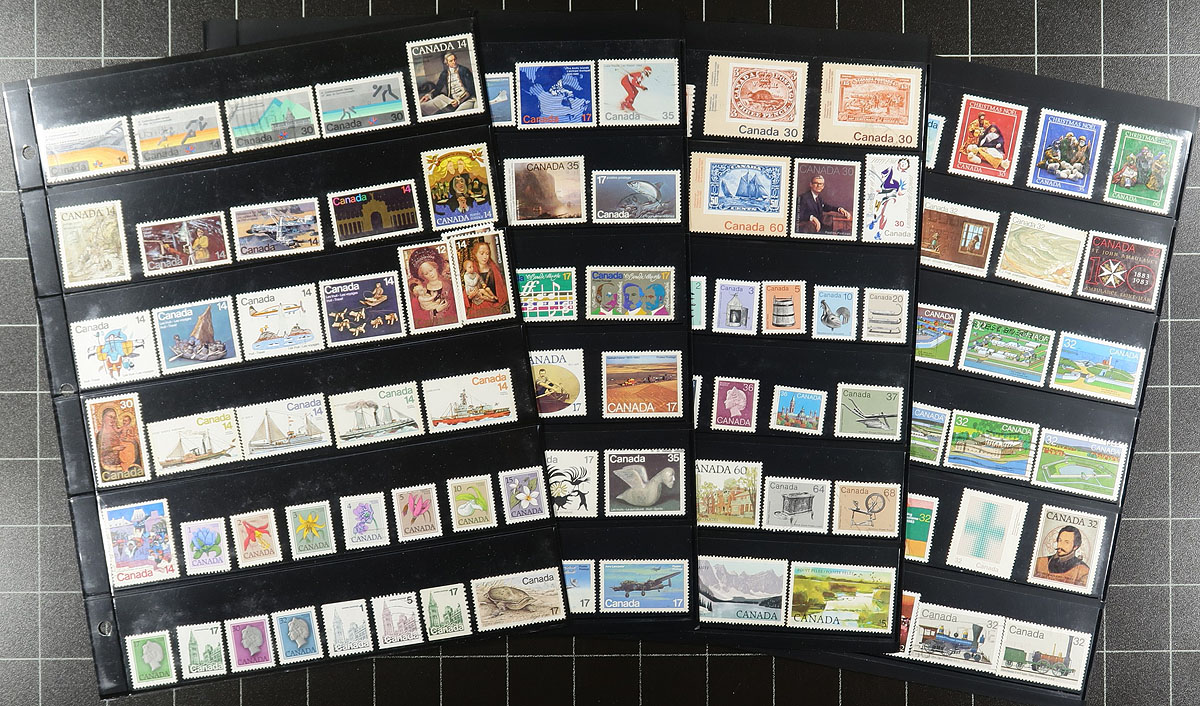 Large used collection of Canada 1859-2020, containing a few thousand stamps, neatly organized in roughly 55 double-sided Vario stock pages, housed in a thick binder. This collection has a little bit of everything including a few Small Queens, Jubilees, Leafs, Numerals, and continues with sets and partial sets of Edwards (full set), Quebecs (up to 7c), Admirals, Scrolls (up to 50c Bluenose), and complete sets of Arch, Pictorials, War and Peace issues. The collection continues with a good run of issues, including many modern used (8 double sided pages of post-2010 issues), along with a small selection of officials (perforated and overprinted), special delivery, revenues, and Newfoundland. A nice lot with duplication up to 10 for only a few issues. Online photos show a small sampling. Estimate =
