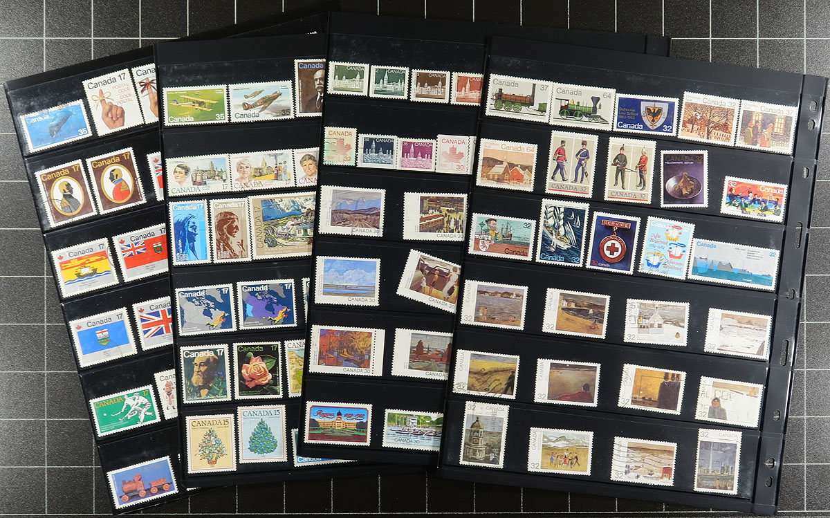 Large used collection of Canada 1859-2020, containing a few thousand stamps, neatly organized in roughly 55 double-sided Vario stock pages, housed in a thick binder. This collection has a little bit of everything including a few Small Queens, Jubilees, Leafs, Numerals, and continues with sets and partial sets of Edwards (full set), Quebecs (up to 7c), Admirals, Scrolls (up to 50c Bluenose), and complete sets of Arch, Pictorials, War and Peace issues. The collection continues with a good run of issues, including many modern used (8 double sided pages of post-2010 issues), along with a small selection of officials (perforated and overprinted), special delivery, revenues, and Newfoundland. A nice lot with duplication up to 10 for only a few issues. Online photos show a small sampling. Estimate =