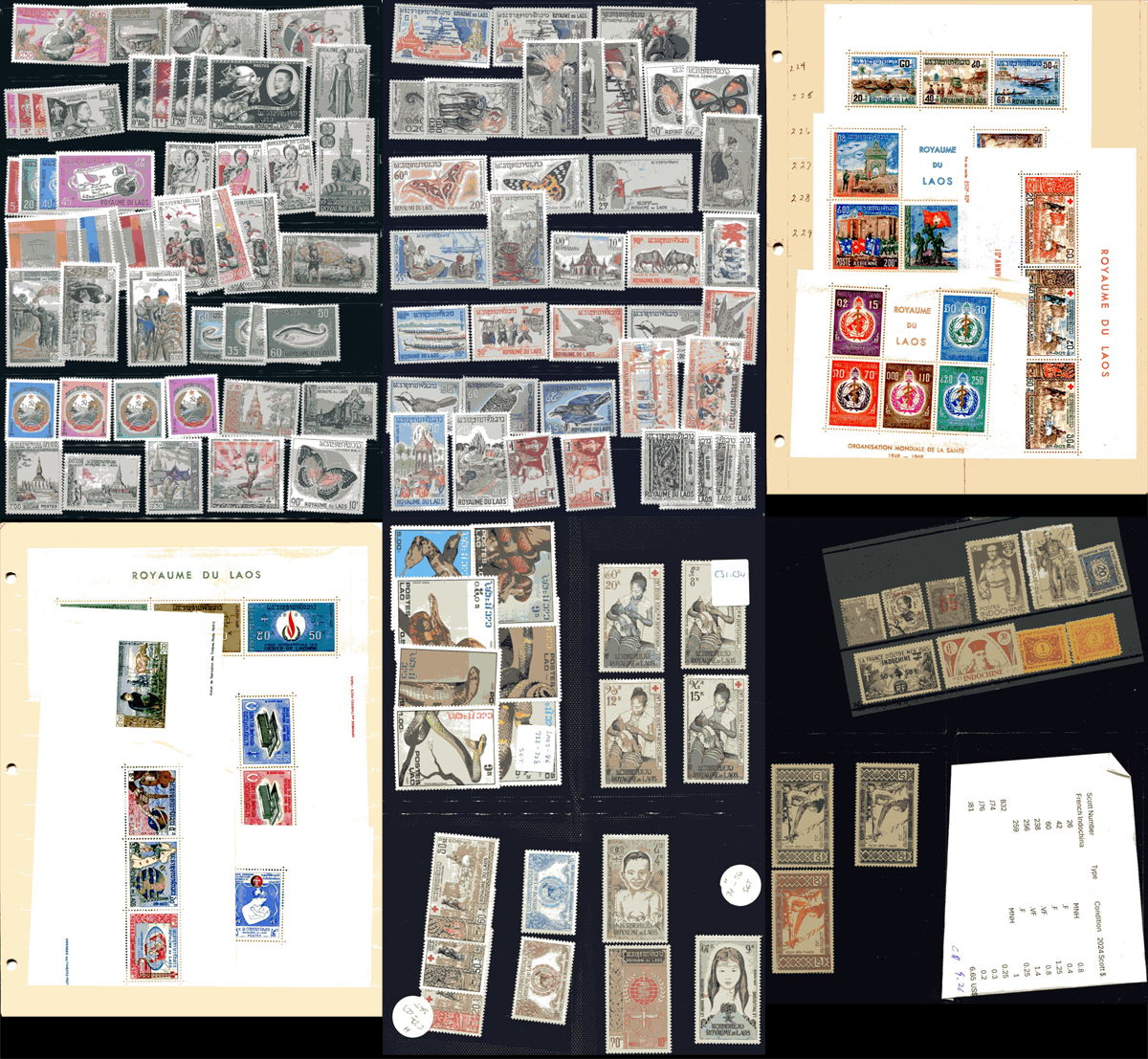 Attractive mint Never Hinged offering of mint Laos, with a touch of Indochina to round things out. Ranging from Scott #48 to 144, plus B9-B11, CP8-CP9 (see owner's detailed inventory list). Owner's 2024 Scott US$214.05 =