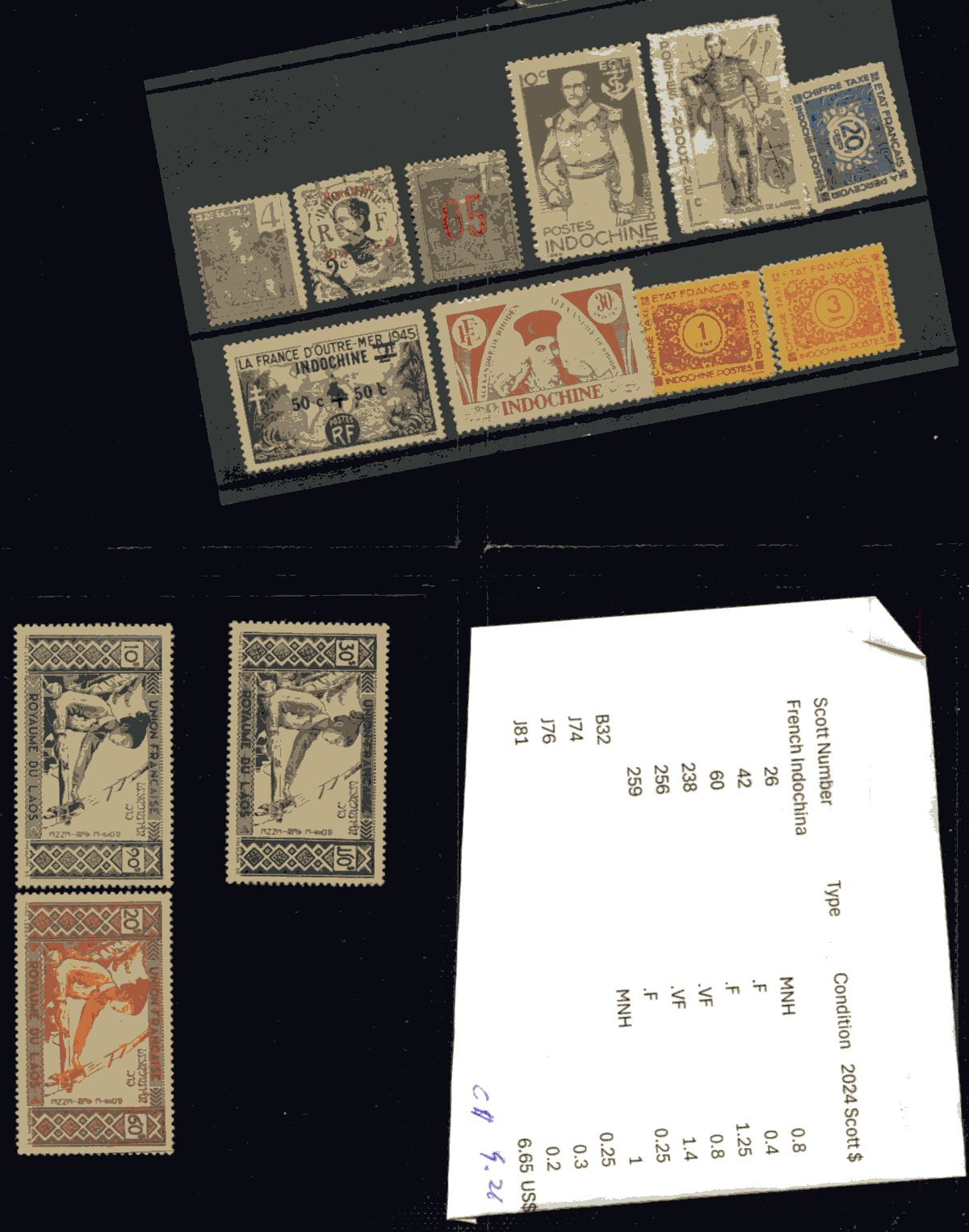 Attractive mint Never Hinged offering of mint Laos, with a touch of Indochina to round things out. Ranging from Scott #48 to 144, plus B9-B11, CP8-CP9 (see owner's detailed inventory list). Owner's 2024 Scott US$214.05 =