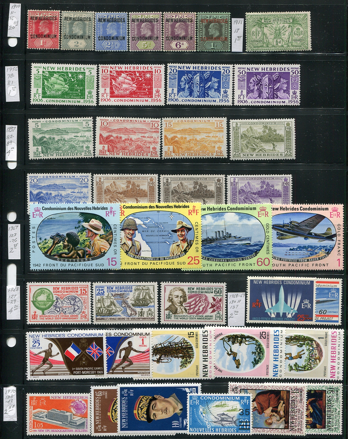 A "British and French" offering including 1910-1980 (British) ranging from #11/279 with 137 stamps, all mint Hinged (earlier) and Never Hinged / Lightly Hinged (later), catalogue US$143.90. The French New Hebrides is represented 1969-1980, all mint Never Hinged with a total of 94 stamps, catalogue US$253.75. All neatly arranged and identified on stockpages. Total 2026 Scott US$397.65 =