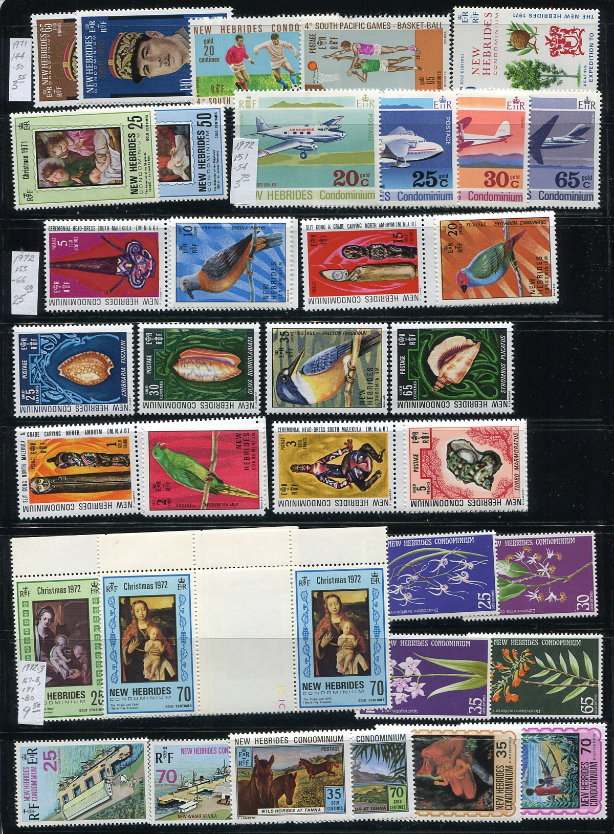 A "British and French" offering including 1910-1980 (British) ranging from #11/279 with 137 stamps, all mint Hinged (earlier) and Never Hinged / Lightly Hinged (later), catalogue US$143.90. The French New Hebrides is represented 1969-1980, all mint Never Hinged with a total of 94 stamps, catalogue US$253.75. All neatly arranged and identified on stockpages. Total 2026 Scott US$397.65 =