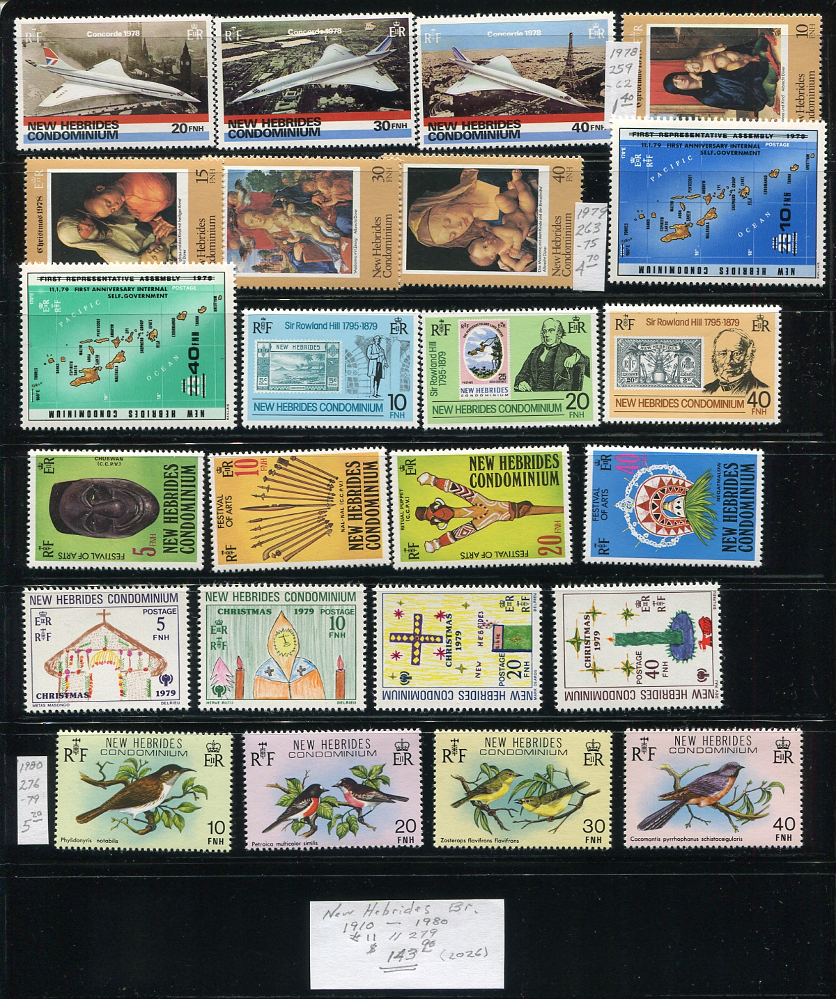 A "British and French" offering including 1910-1980 (British) ranging from #11/279 with 137 stamps, all mint Hinged (earlier) and Never Hinged / Lightly Hinged (later), catalogue US$143.90. The French New Hebrides is represented 1969-1980, all mint Never Hinged with a total of 94 stamps, catalogue US$253.75. All neatly arranged and identified on stockpages. Total 2026 Scott US$397.65 =