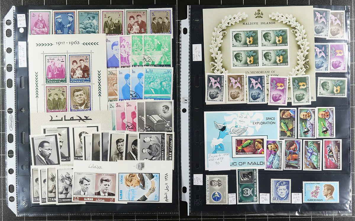 JFK - John F. Kennedy Topical Stamp Collection 1964-1965. A wide ranging mint Never Hinged selection of stamps / souvenir sheets from Ajman to Umm al Qiwain, all neatly arranged and identified on stockpages (including some items not listed in Scott, which the owner has identified with Michel catalogue if available).Total 2026 Scott US$696.05 =