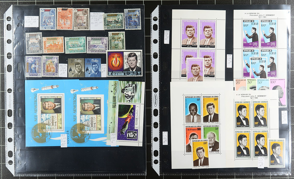 JFK - John F. Kennedy Topical Stamp Collection 1964-1965. A wide ranging mint Never Hinged selection of stamps / souvenir sheets from Ajman to Umm al Qiwain, all neatly arranged and identified on stockpages (including some items not listed in Scott, which the owner has identified with Michel catalogue if available).Total 2026 Scott US$696.05 =
