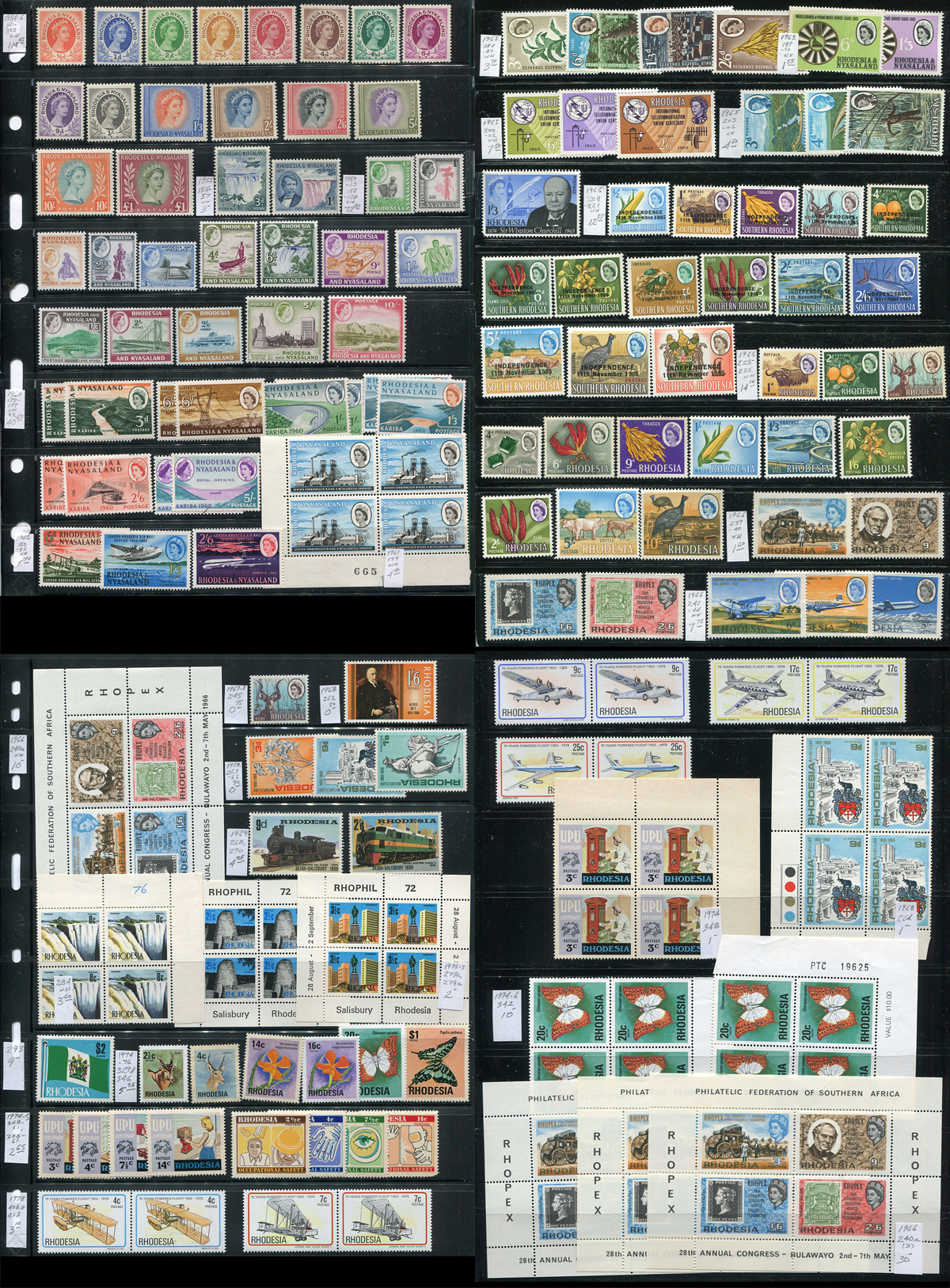 A two-part mint collection, which includes Rhodesia & Nyasaland (1954-1963, #141/190, 57 stamps, cat US$246.20) and Rhodesia (1965-1978, #200/413, 116 stamps, cat US132.80). A combination of Lightly Hinged / Hinged items, with earlier items being Hinged, and most later Never Hinged. All neatly arranged and identified on stockpages. 2026 Scott US$379.00 =