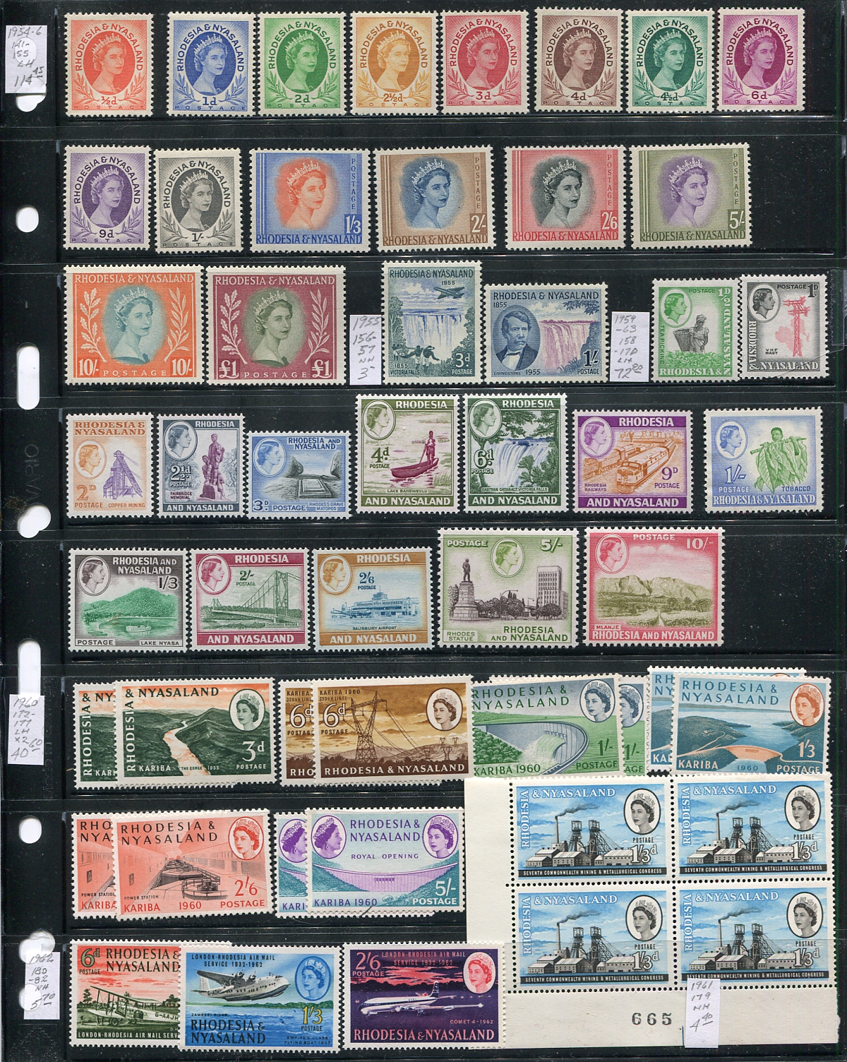 A two-part mint collection, which includes Rhodesia & Nyasaland (1954-1963, #141/190, 57 stamps, cat US$246.20) and Rhodesia (1965-1978, #200/413, 116 stamps, cat US132.80). A combination of Lightly Hinged / Hinged items, with earlier items being Hinged, and most later Never Hinged. All neatly arranged and identified on stockpages. 2026 Scott US$379.00 =