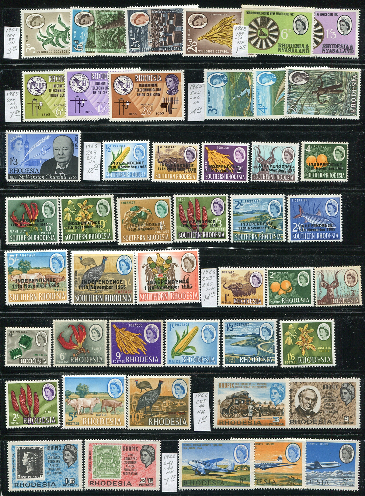 A two-part mint collection, which includes Rhodesia & Nyasaland (1954-1963, #141/190, 57 stamps, cat US$246.20) and Rhodesia (1965-1978, #200/413, 116 stamps, cat US132.80). A combination of Lightly Hinged / Hinged items, with earlier items being Hinged, and most later Never Hinged. All neatly arranged and identified on stockpages. 2026 Scott US$379.00 =