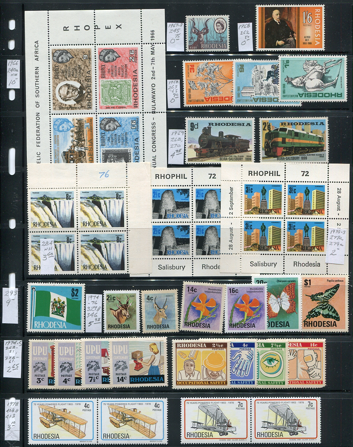 A two-part mint collection, which includes Rhodesia & Nyasaland (1954-1963, #141/190, 57 stamps, cat US$246.20) and Rhodesia (1965-1978, #200/413, 116 stamps, cat US132.80). A combination of Lightly Hinged / Hinged items, with earlier items being Hinged, and most later Never Hinged. All neatly arranged and identified on stockpages. 2026 Scott US$379.00 =