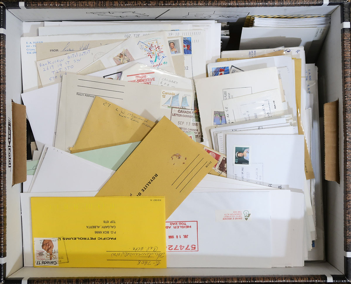Alberta Postal History. Nice accumulation of roughly 1,000 covers collected for Alberta town postmarks, 1960's-2022, filling a bankers box. A cursory check indicated several hundred different towns, including several RPO offices from major centres, ranging from A to Y, including Southland Crossing RPO, Heisler, York Landing, Nanoose Bay, Redwater, Redcliff, Hidden Valley, Drayton Valley, Czar, Mackenzie Towne RPO, and so much more. Postmark interest includes cds, split ring, pictorial, Klussendorf, MOON, and POCON types, including a few ancillary postmarks noting "Letter Carrier Depot No 1", "Calgary Alberta Lock Boxes", and a few others. Duplication for some towns range from 10-20 and up, with most towns having a variety of postmark types and frankings. A very nice lot for the Alberta or Canada postmark town collector. Estimate =