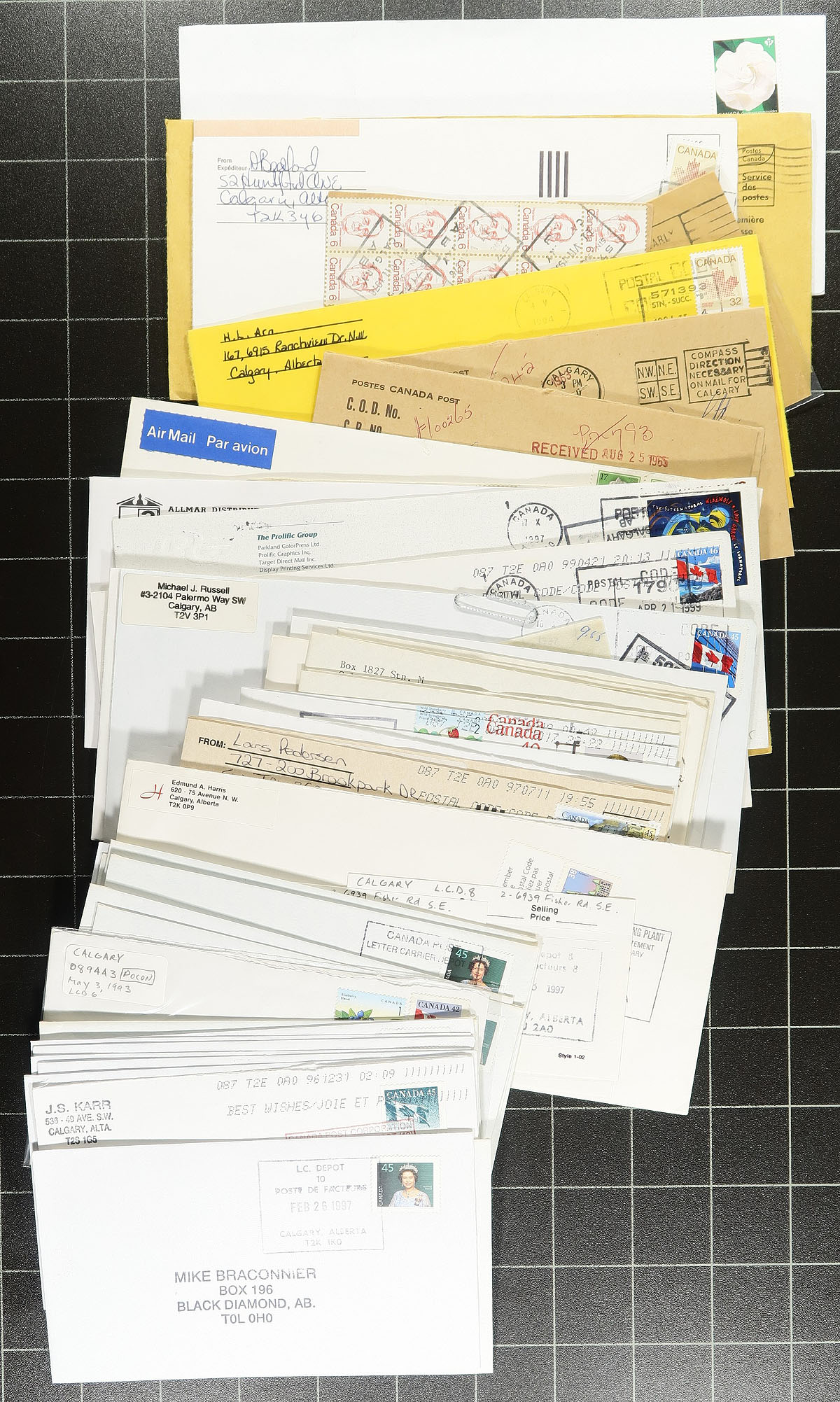 Alberta Postal History. Nice accumulation of roughly 1,000 covers collected for Alberta town postmarks, 1960's-2022, filling a bankers box. A cursory check indicated several hundred different towns, including several RPO offices from major centres, ranging from A to Y, including Southland Crossing RPO, Heisler, York Landing, Nanoose Bay, Redwater, Redcliff, Hidden Valley, Drayton Valley, Czar, Mackenzie Towne RPO, and so much more. Postmark interest includes cds, split ring, pictorial, Klussendorf, MOON, and POCON types, including a few ancillary postmarks noting "Letter Carrier Depot No 1", "Calgary Alberta Lock Boxes", and a few others. Duplication for some towns range from 10-20 and up, with most towns having a variety of postmark types and frankings. A very nice lot for the Alberta or Canada postmark town collector. Estimate =