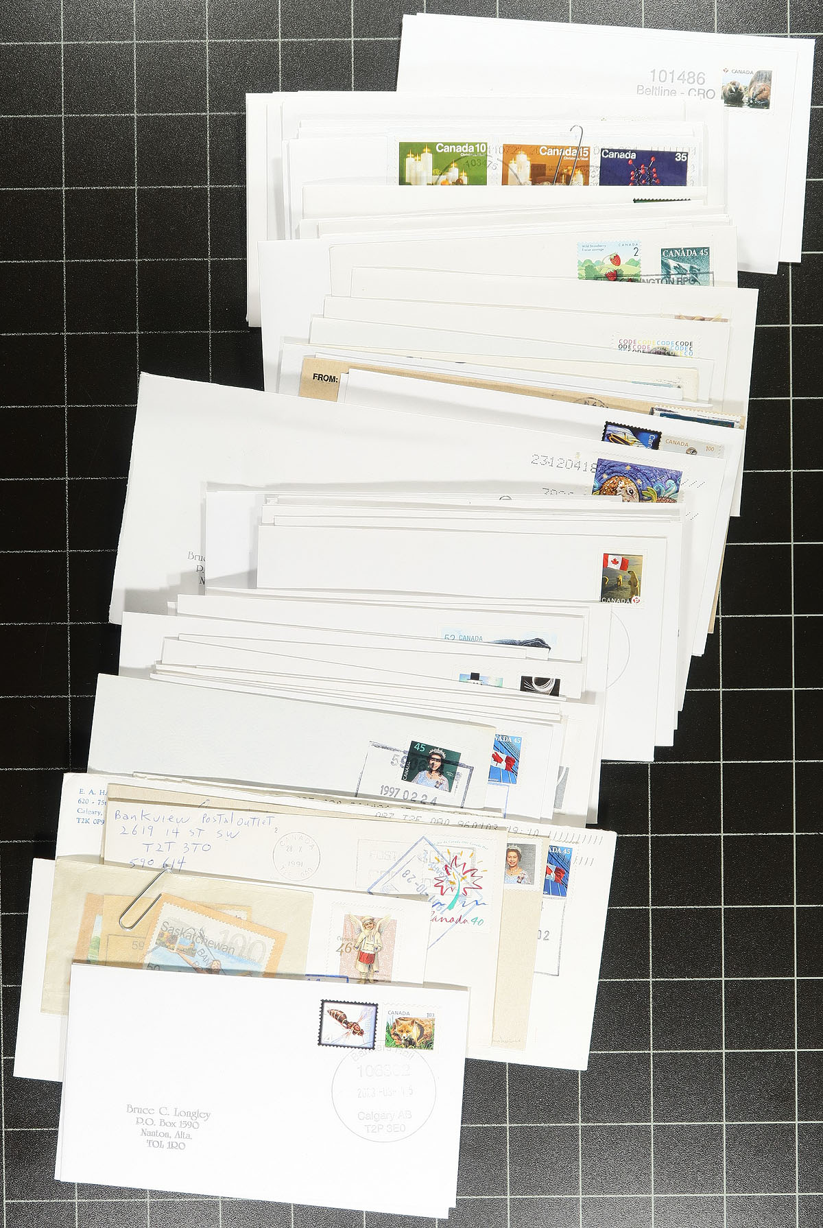Alberta Postal History. Nice accumulation of roughly 1,000 covers collected for Alberta town postmarks, 1960's-2022, filling a bankers box. A cursory check indicated several hundred different towns, including several RPO offices from major centres, ranging from A to Y, including Southland Crossing RPO, Heisler, York Landing, Nanoose Bay, Redwater, Redcliff, Hidden Valley, Drayton Valley, Czar, Mackenzie Towne RPO, and so much more. Postmark interest includes cds, split ring, pictorial, Klussendorf, MOON, and POCON types, including a few ancillary postmarks noting "Letter Carrier Depot No 1", "Calgary Alberta Lock Boxes", and a few others. Duplication for some towns range from 10-20 and up, with most towns having a variety of postmark types and frankings. A very nice lot for the Alberta or Canada postmark town collector. Estimate =