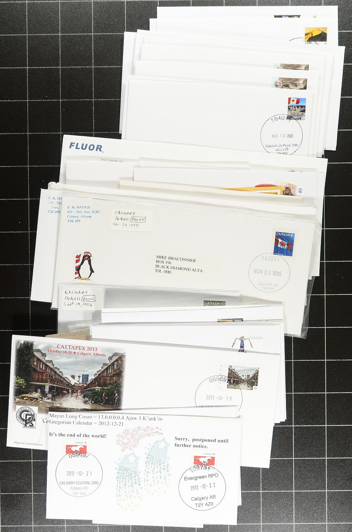 Alberta Postal History. Nice accumulation of roughly 1,000 covers collected for Alberta town postmarks, 1960's-2022, filling a bankers box. A cursory check indicated several hundred different towns, including several RPO offices from major centres, ranging from A to Y, including Southland Crossing RPO, Heisler, York Landing, Nanoose Bay, Redwater, Redcliff, Hidden Valley, Drayton Valley, Czar, Mackenzie Towne RPO, and so much more. Postmark interest includes cds, split ring, pictorial, Klussendorf, MOON, and POCON types, including a few ancillary postmarks noting "Letter Carrier Depot No 1", "Calgary Alberta Lock Boxes", and a few others. Duplication for some towns range from 10-20 and up, with most towns having a variety of postmark types and frankings. A very nice lot for the Alberta or Canada postmark town collector. Estimate =