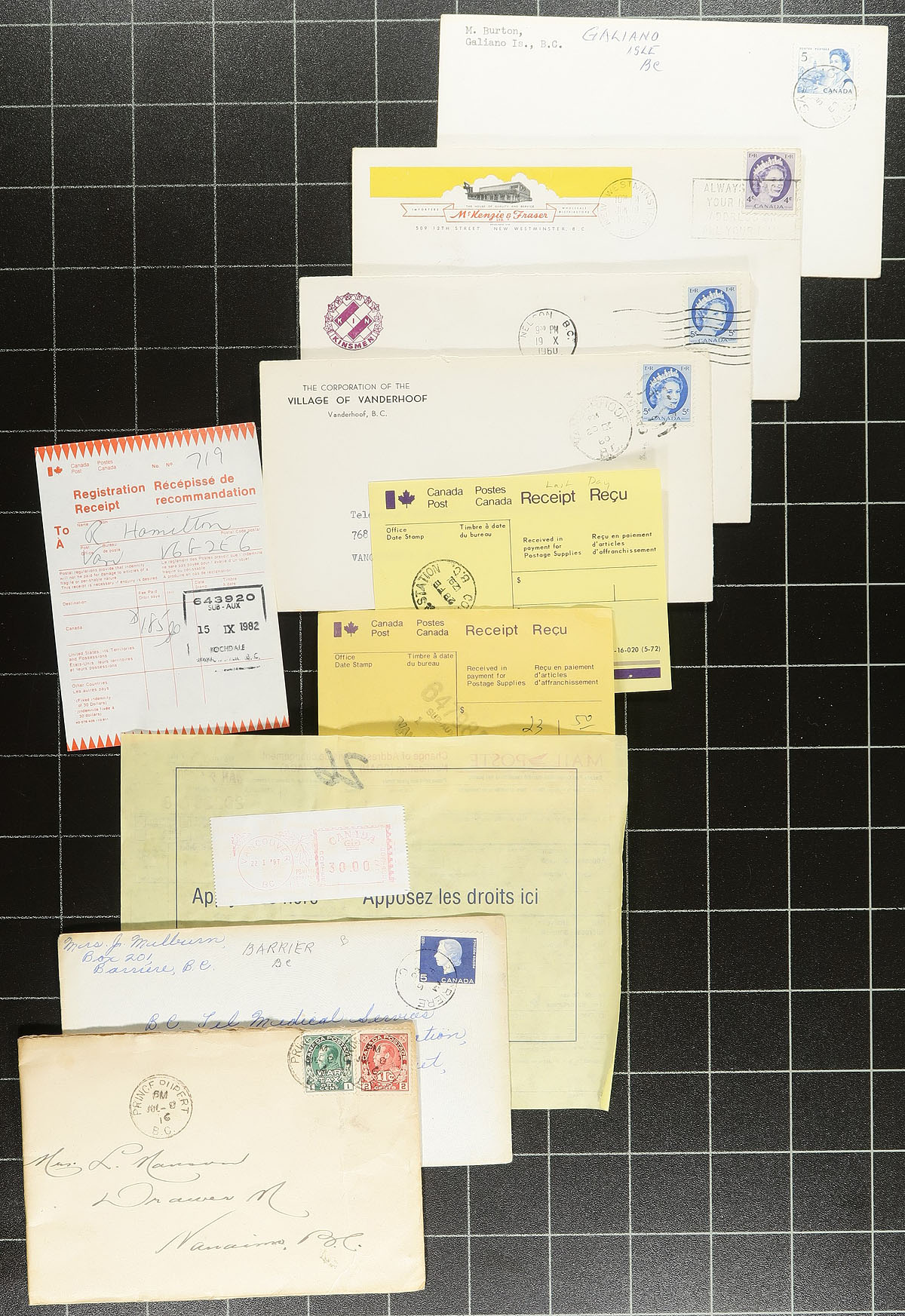 British Columbia Postal History. Good accumulation of roughly 350 covers collected for British Columbia town postmarks, 1910's-1990's, in a small plastic tub. A cursory check indicated a few hundred towns ranging from A to V, including Lochdale, Nelson, Vanderhoof, Prince Rupert, Galiano Isle, Barriere, and more. Most of the material appears to range from the 1960's to the 1980's, including over 100 Post Office receipts with a variety of town postmarks. Just a few of the postmark types include cds, MOON, POCONS, Klussendorf, Pictorial, and likely a few others, along with some corner advertising envelopes. Some mild duplication for some towns, noting different postmark types or frankings. A nice lot for the British Columbia or Canada town cancel collector. Estimate =
