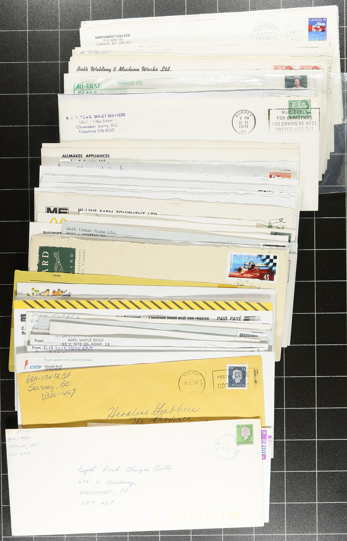 British Columbia Postal History. Good accumulation of roughly 350 covers collected for British Columbia town postmarks, 1910's-1990's, in a small plastic tub. A cursory check indicated a few hundred towns ranging from A to V, including Lochdale, Nelson, Vanderhoof, Prince Rupert, Galiano Isle, Barriere, and more. Most of the material appears to range from the 1960's to the 1980's, including over 100 Post Office receipts with a variety of town postmarks. Just a few of the postmark types include cds, MOON, POCONS, Klussendorf, Pictorial, and likely a few others, along with some corner advertising envelopes. Some mild duplication for some towns, noting different postmark types or frankings. A nice lot for the British Columbia or Canada town cancel collector. Estimate =