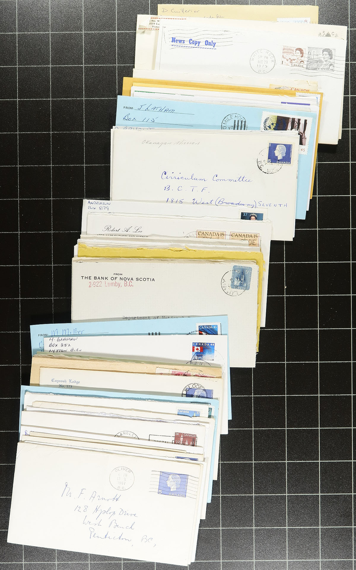 British Columbia Postal History. Good accumulation of roughly 350 covers collected for British Columbia town postmarks, 1910's-1990's, in a small plastic tub. A cursory check indicated a few hundred towns ranging from A to V, including Lochdale, Nelson, Vanderhoof, Prince Rupert, Galiano Isle, Barriere, and more. Most of the material appears to range from the 1960's to the 1980's, including over 100 Post Office receipts with a variety of town postmarks. Just a few of the postmark types include cds, MOON, POCONS, Klussendorf, Pictorial, and likely a few others, along with some corner advertising envelopes. Some mild duplication for some towns, noting different postmark types or frankings. A nice lot for the British Columbia or Canada town cancel collector. Estimate =