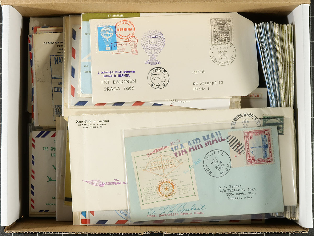 Airmail Covers. Nice group of roughly 125 Airmail covers, 1920's-1970's, including first flights, airport dedications, anniversary flights, helicopter and balloon flights, along with some pilot signed covers. We note better representation from the United States and Canada, along with some European and South America material. The lot also includes some interesting route maps from New Zealand giving town information, main routes and other points of interest. Some of the covers retail $10 to $20 each, making this a nice lot for collectors and dealers alike. Estimate =