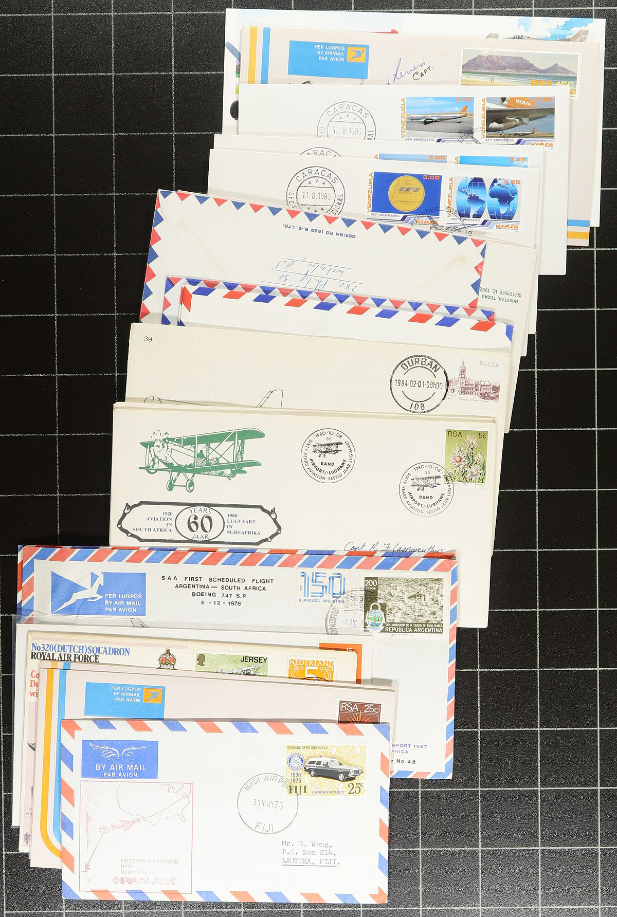 Airmail Covers. Nice group of roughly 125 Airmail covers, 1920's-1970's, including first flights, airport dedications, anniversary flights, helicopter and balloon flights, along with some pilot signed covers. We note better representation from the United States and Canada, along with some European and South America material. The lot also includes some interesting route maps from New Zealand giving town information, main routes and other points of interest. Some of the covers retail $10 to $20 each, making this a nice lot for collectors and dealers alike. Estimate =