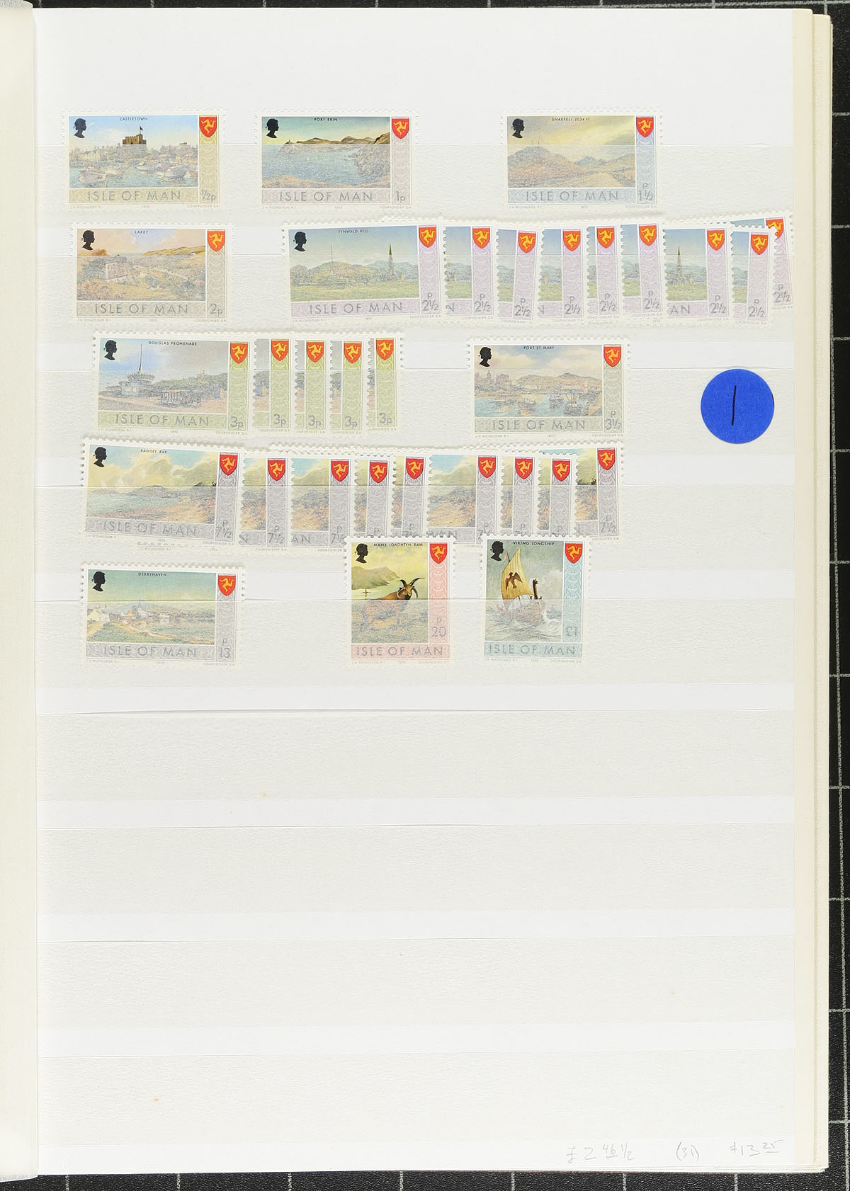 Large stock of never hinged Isle of Man, 1973-1998, containing over 2,000 stamps in a stockbook. This neatly organized lot ranges from Scott #12/802, containing several sets, gutter pairs, blocks, and a few back of the book items. Duplication of sets generally range from 3 to 5 and up each. Owner's 2018 Scott catalogue value for the lot totals US$1,149.00 ($1551.15 CDN), making this a nice lot for collectors, especially topical and thematic folks, and dealers alike. Clean and very fine. Estimate =