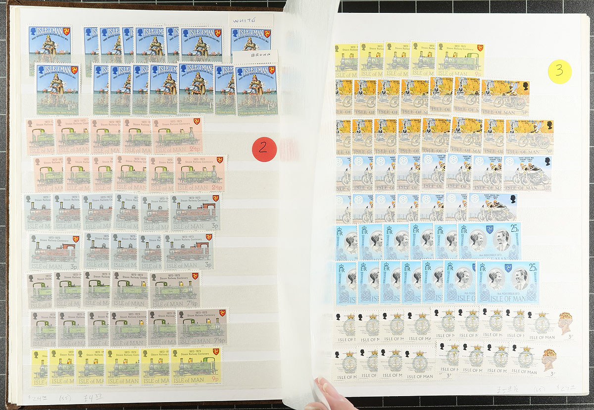 Large stock of never hinged Isle of Man, 1973-1998, containing over 2,000 stamps in a stockbook. This neatly organized lot ranges from Scott #12/802, containing several sets, gutter pairs, blocks, and a few back of the book items. Duplication of sets generally range from 3 to 5 and up each. Owner's 2018 Scott catalogue value for the lot totals US$1,149.00 ($1551.15 CDN), making this a nice lot for collectors, especially topical and thematic folks, and dealers alike. Clean and very fine. Estimate =