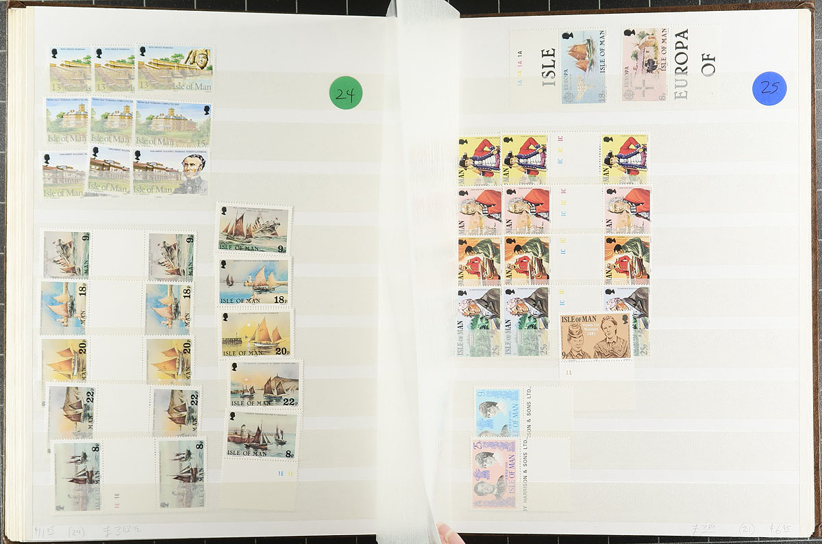Large stock of never hinged Isle of Man, 1973-1998, containing over 2,000 stamps in a stockbook. This neatly organized lot ranges from Scott #12/802, containing several sets, gutter pairs, blocks, and a few back of the book items. Duplication of sets generally range from 3 to 5 and up each. Owner's 2018 Scott catalogue value for the lot totals US$1,149.00 ($1551.15 CDN), making this a nice lot for collectors, especially topical and thematic folks, and dealers alike. Clean and very fine. Estimate =