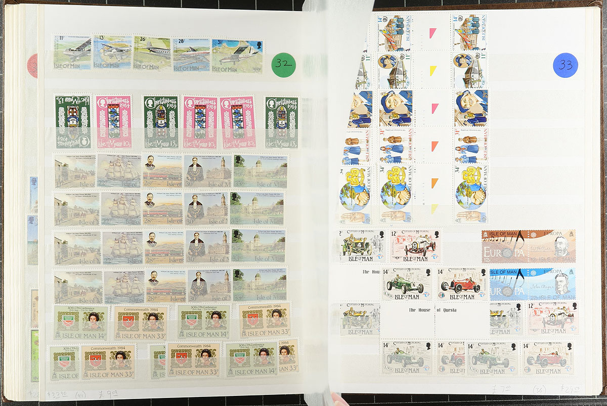 Large stock of never hinged Isle of Man, 1973-1998, containing over 2,000 stamps in a stockbook. This neatly organized lot ranges from Scott #12/802, containing several sets, gutter pairs, blocks, and a few back of the book items. Duplication of sets generally range from 3 to 5 and up each. Owner's 2018 Scott catalogue value for the lot totals US$1,149.00 ($1551.15 CDN), making this a nice lot for collectors, especially topical and thematic folks, and dealers alike. Clean and very fine. Estimate =