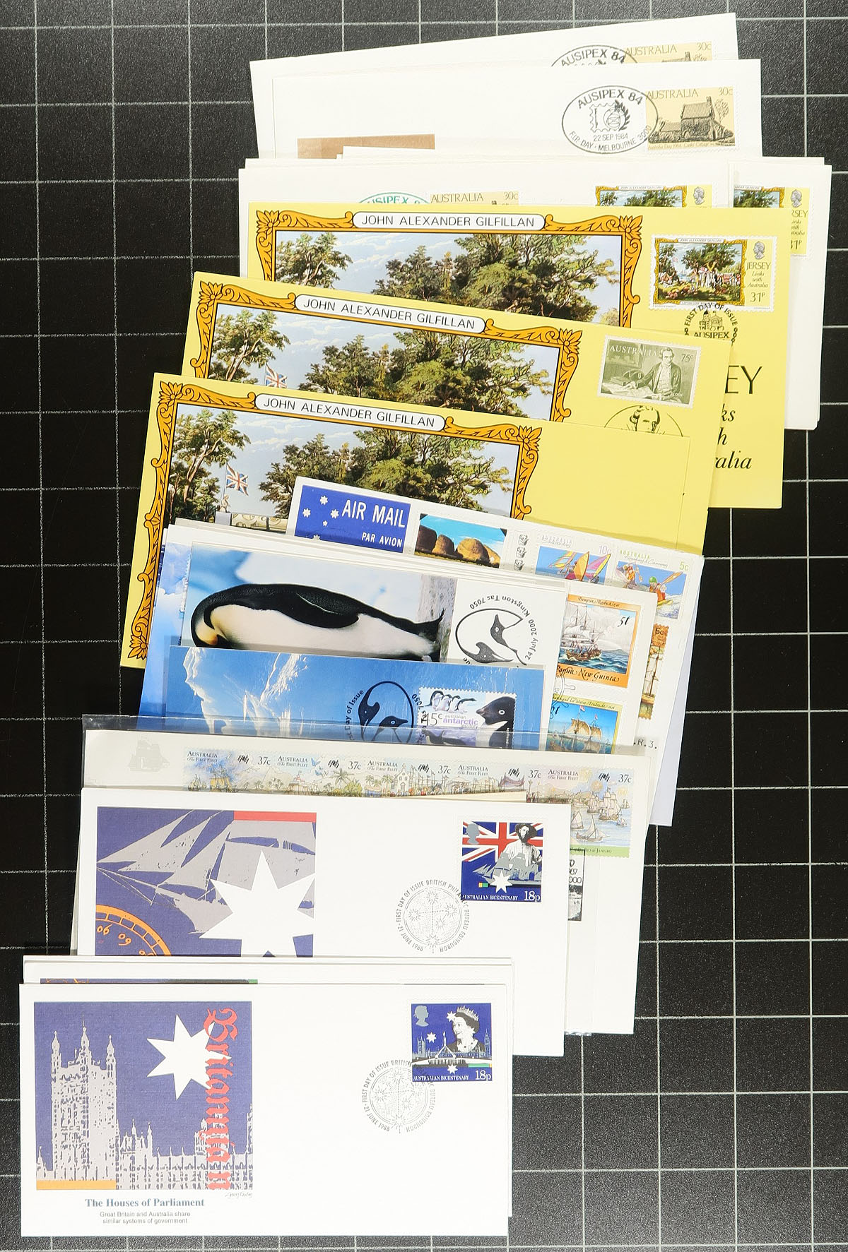 Commonwealth Covers. Nice group of roughly 225 British Commonwealth covers, 1940's-1990's, with representation from Hong Kong, New Zealand (some still in original post office packaging), Australia and Australian Antarctic Territory, Gibraltar, and a few other regions. We note mostly first day covers with singles, sets, and souvenir sheet frankings, along with aerogrammes, commercial letters, maximum cards, and some interesting material from the Hong Kong 1997 stamp exhibition, and more. We note a few covers cataloguing from $5 to $10 each. A nice lot for collectors and dealers alike. Estimate =