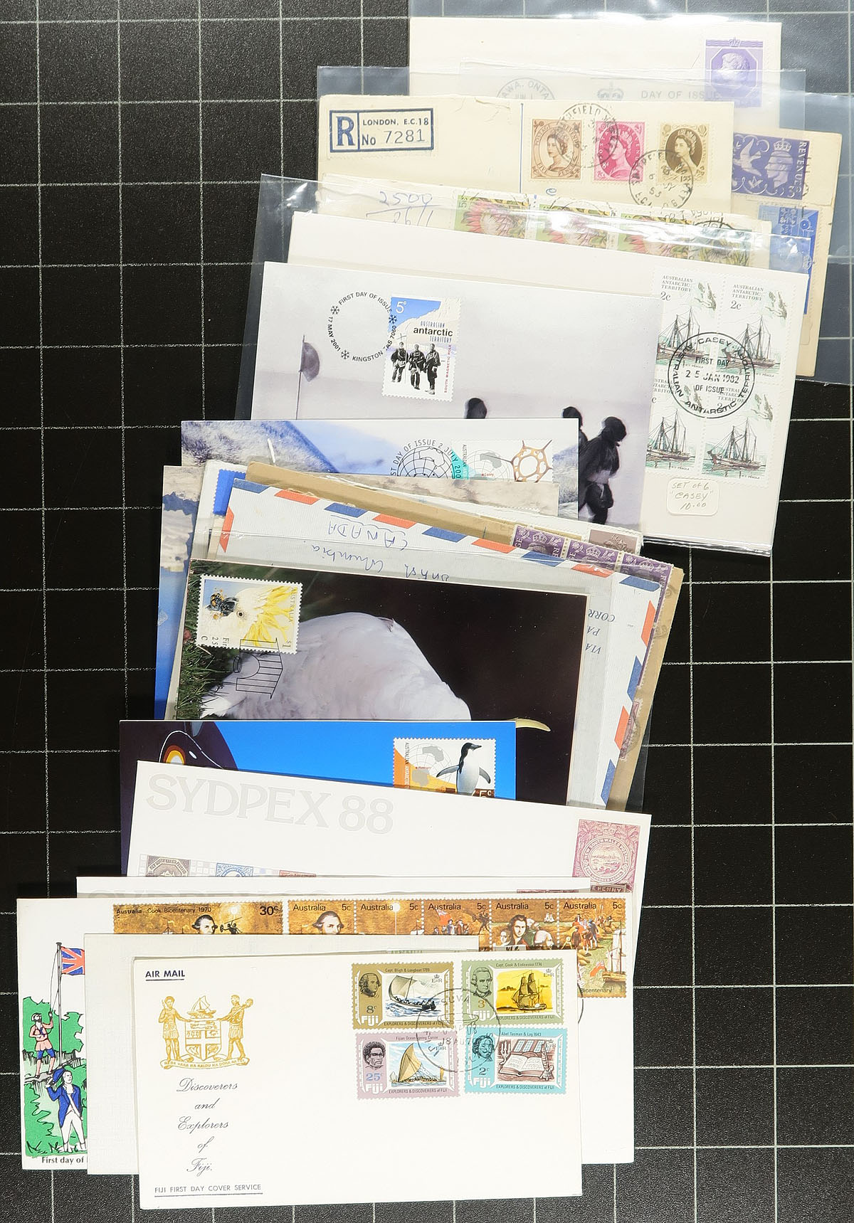 Commonwealth Covers. Nice group of roughly 225 British Commonwealth covers, 1940's-1990's, with representation from Hong Kong, New Zealand (some still in original post office packaging), Australia and Australian Antarctic Territory, Gibraltar, and a few other regions. We note mostly first day covers with singles, sets, and souvenir sheet frankings, along with aerogrammes, commercial letters, maximum cards, and some interesting material from the Hong Kong 1997 stamp exhibition, and more. We note a few covers cataloguing from $5 to $10 each. A nice lot for collectors and dealers alike. Estimate =