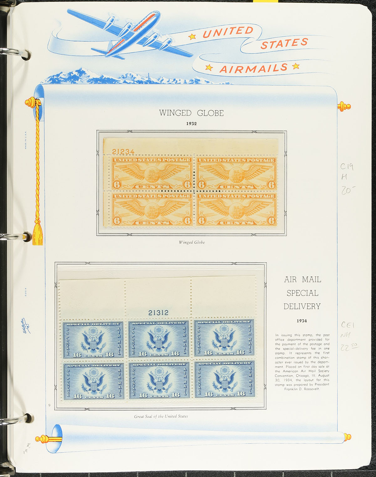 Collection of never hinged plate blocks of airmail and back of the book issues, 1926-1976, all in hingeless White Ace album pages with binder and slipcase. The lot contains 75 blocks in total, mostly ranging from Scott #C7/C90, along with a few special delivery and postage dues. A few of the better items include C7 (block of 6, c.v. $47.50), C10 (block of 6, $130), C11 (block of 6, "double TOP", $160), along with a few items cataloging $5 to $10 and up. 2026 Scott US$396.20 =