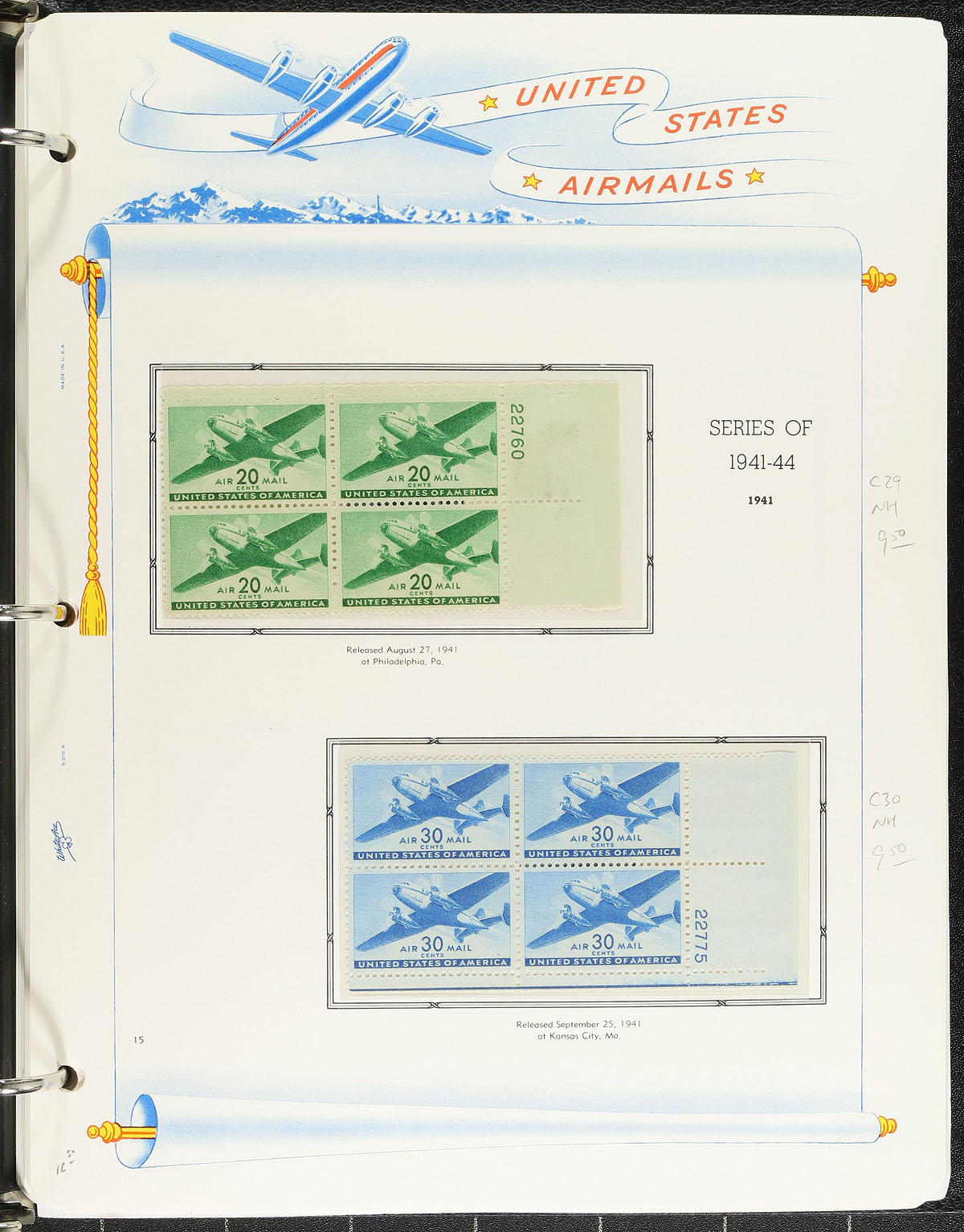 Collection of never hinged plate blocks of airmail and back of the book issues, 1926-1976, all in hingeless White Ace album pages with binder and slipcase. The lot contains 75 blocks in total, mostly ranging from Scott #C7/C90, along with a few special delivery and postage dues. A few of the better items include C7 (block of 6, c.v. $47.50), C10 (block of 6, $130), C11 (block of 6, "double TOP", $160), along with a few items cataloging $5 to $10 and up. 2026 Scott US$396.20 =