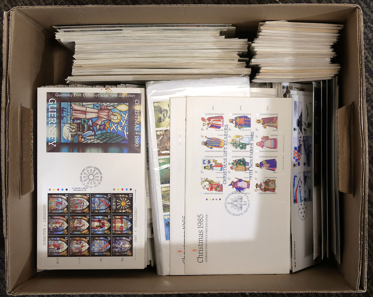 Nice group of roughly 425 first day covers, 1970's-2000's, containing roughly 300 Great Britain covers, and over 100 covers from Guernsey, noting singles, several sets, souvenir sheet, and booklet frankings. A spot check indicated some sets cataloguing $5 to $10 each (counted as used stamps). A nice lot for collectors and dealers, noting a few covers having a few bent corners, still a very nice lot. Estimate =