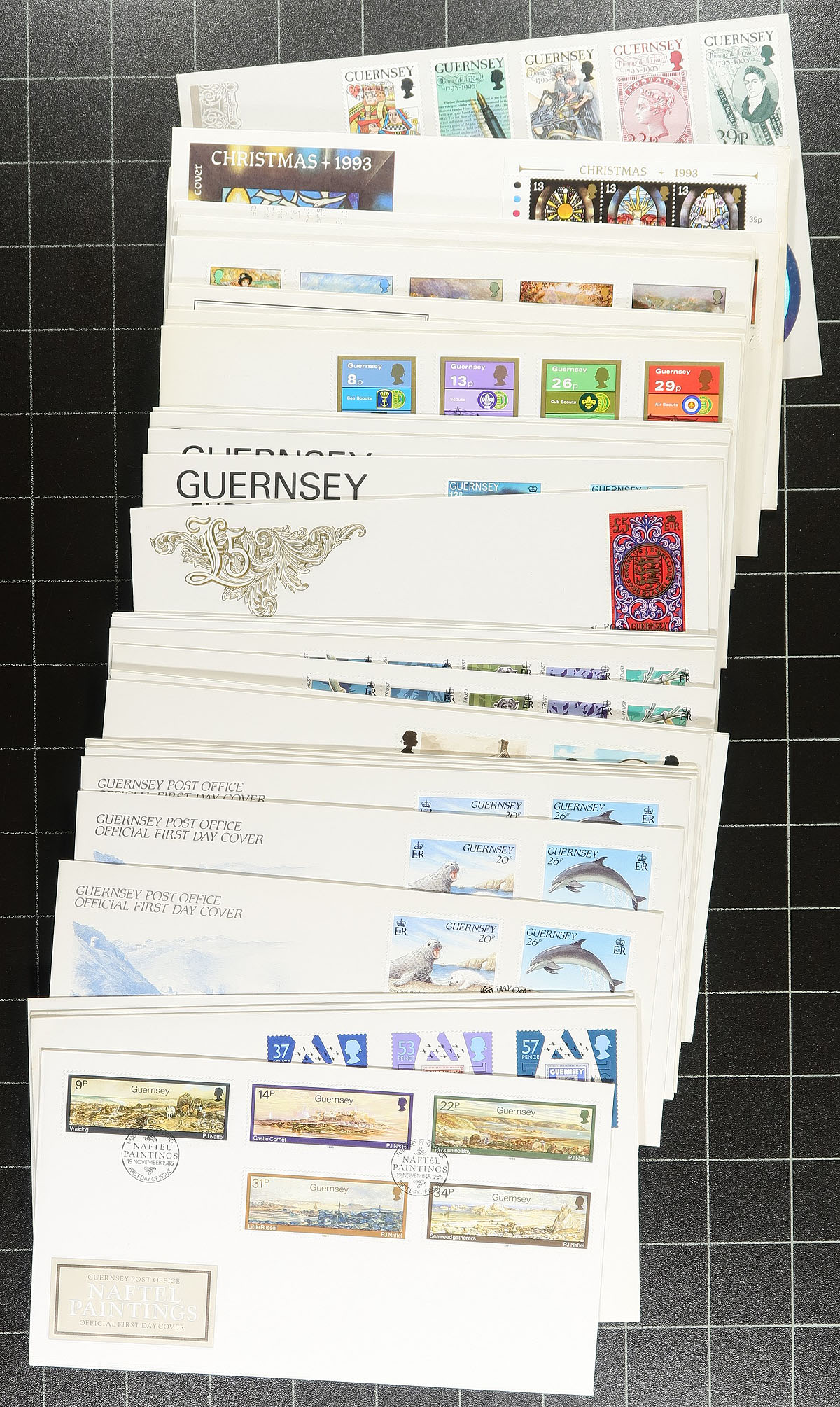 Nice group of roughly 425 first day covers, 1970's-2000's, containing roughly 300 Great Britain covers, and over 100 covers from Guernsey, noting singles, several sets, souvenir sheet, and booklet frankings. A spot check indicated some sets cataloguing $5 to $10 each (counted as used stamps). A nice lot for collectors and dealers, noting a few covers having a few bent corners, still a very nice lot. Estimate =