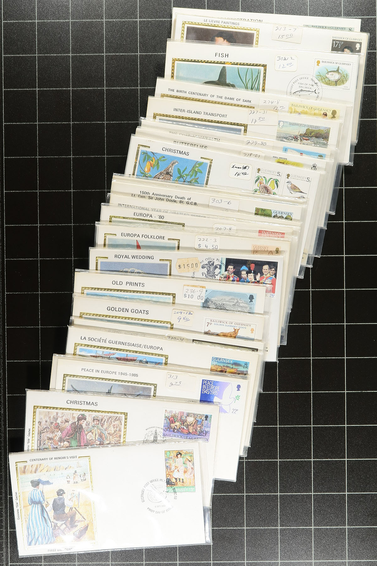 Nice group of roughly 425 first day covers, 1970's-2000's, containing roughly 300 Great Britain covers, and over 100 covers from Guernsey, noting singles, several sets, souvenir sheet, and booklet frankings. A spot check indicated some sets cataloguing $5 to $10 each (counted as used stamps). A nice lot for collectors and dealers, noting a few covers having a few bent corners, still a very nice lot. Estimate =