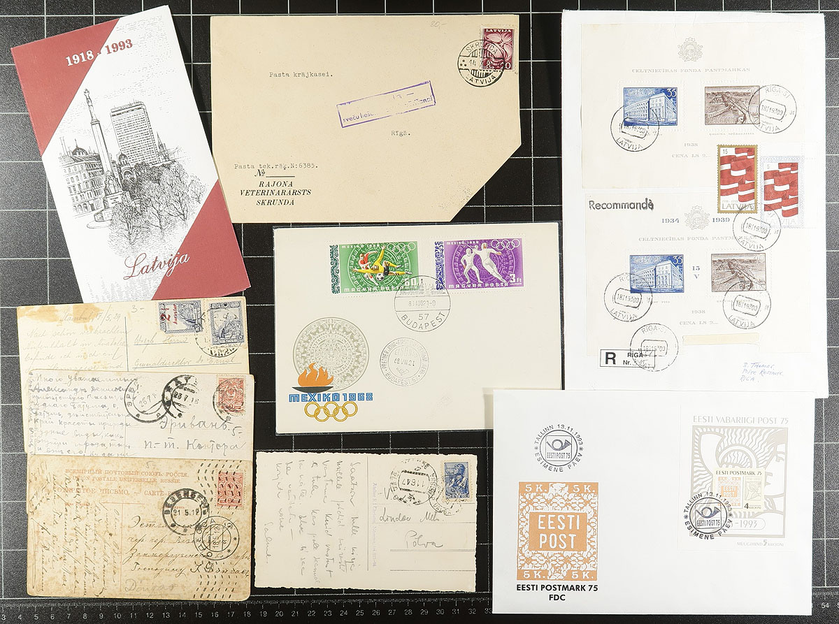 Eastern Europe Covers and Cards. Interesting group of roughly 300 covers and postcards, 1910''s-1970s, with the vast majority of material from Russia / Soviet Union, noting first day covers with singles, sets, and souvenir sheet frankings, along with some material from Estonia and Latvia, including several post cards, philatelic mail, and town postmarks. An interesting lot for collectors, with perhaps a few better items within, along with some nice topical and thematic frankings from the Soviet Union. Overall fine to very fine. Estimate =