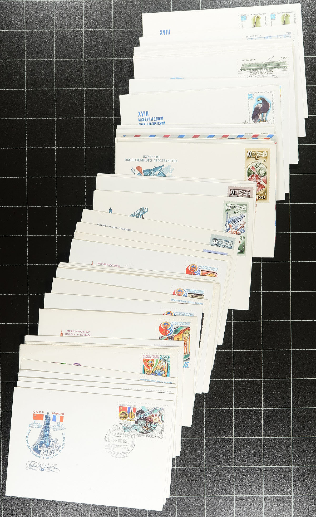 Eastern Europe Covers and Cards. Interesting group of roughly 300 covers and postcards, 1910''s-1970s, with the vast majority of material from Russia / Soviet Union, noting first day covers with singles, sets, and souvenir sheet frankings, along with some material from Estonia and Latvia, including several post cards, philatelic mail, and town postmarks. An interesting lot for collectors, with perhaps a few better items within, along with some nice topical and thematic frankings from the Soviet Union. Overall fine to very fine. Estimate =