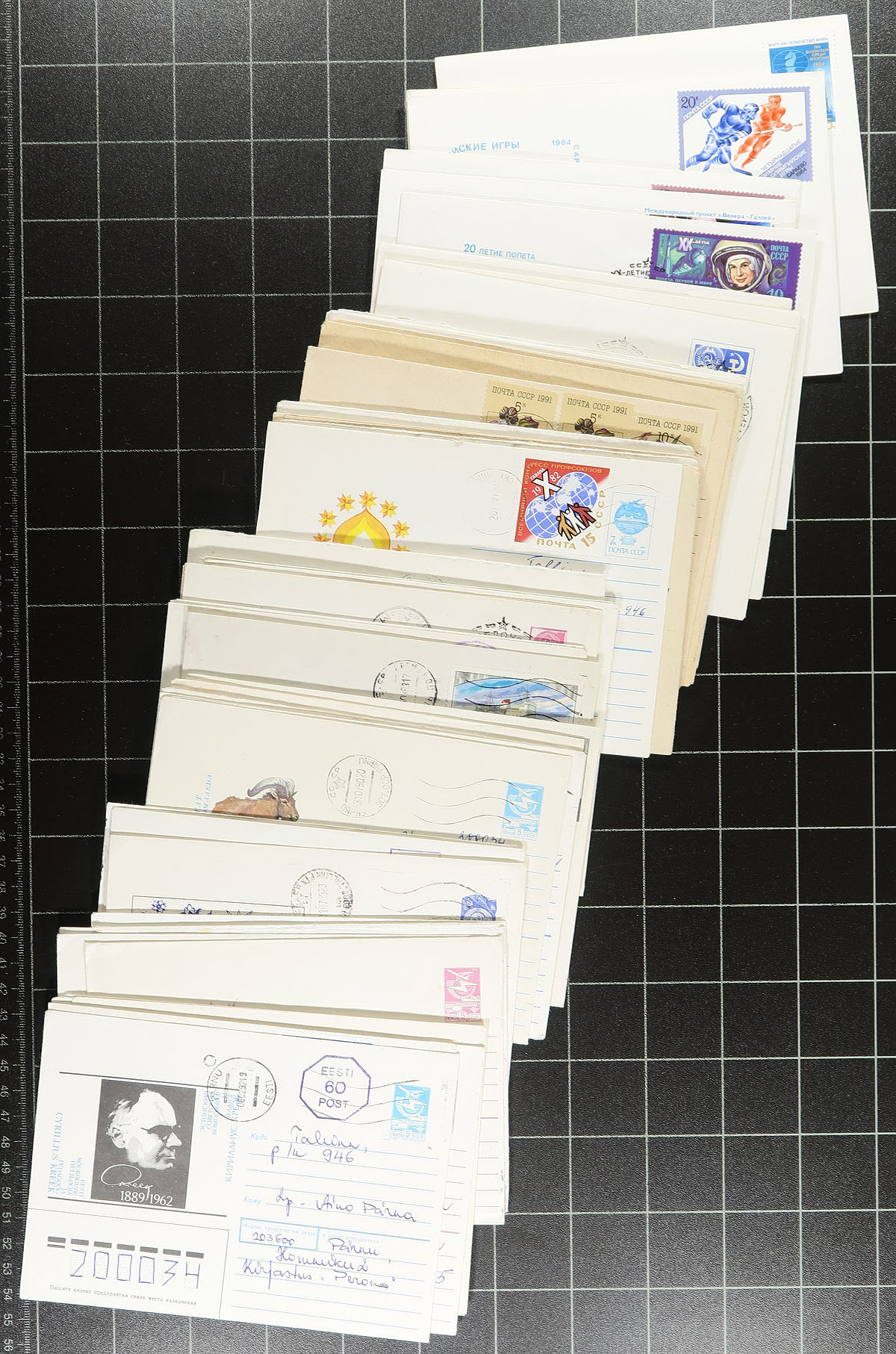 Eastern Europe Covers and Cards. Interesting group of roughly 300 covers and postcards, 1910''s-1970s, with the vast majority of material from Russia / Soviet Union, noting first day covers with singles, sets, and souvenir sheet frankings, along with some material from Estonia and Latvia, including several post cards, philatelic mail, and town postmarks. An interesting lot for collectors, with perhaps a few better items within, along with some nice topical and thematic frankings from the Soviet Union. Overall fine to very fine. Estimate =