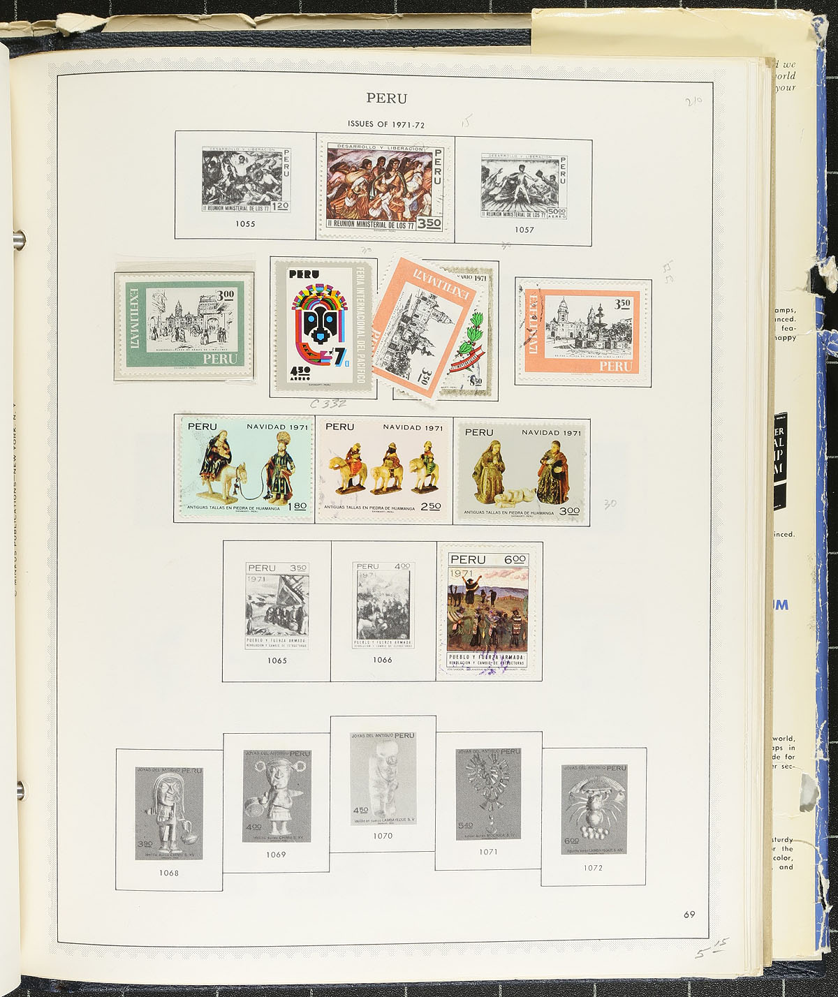 South America - Chile & Peru. An attractive old-time Minkus album, with pages for both countries running from the beginning to the mid-1980's. A mix of both mint and used, many of the mint (especially the later periods) are in mounts, leaving the stamps Never Hinged. The Chile section runs 1862-1985 (#11/693), with 1060 stamps including "back of the book" issues (catalogue US$1348.10). The Peru section runs 1858-1983 (#4/788) with 1017 stamps, including "back of the book" (catalogue US$1125.10). Expect the odd fault, some loose stamps that need placing, and perhaps the odd reprint in the earlier material. That being said, this is an excellent opportunity for any South American collector, with a still usable old-time album as a bonus. Total 2026 Scott US$2,473.20 =