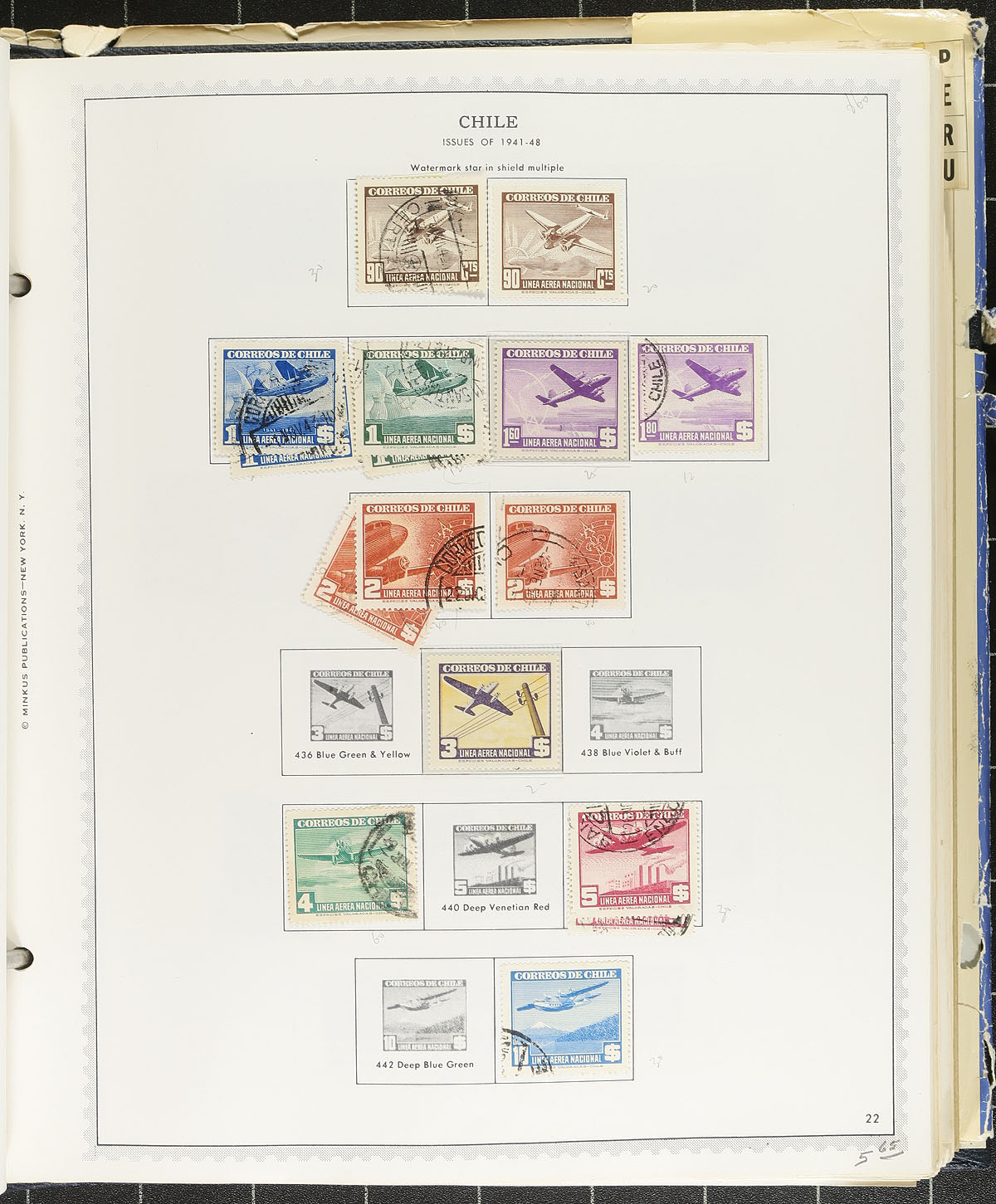 South America - Chile & Peru. An attractive old-time Minkus album, with pages for both countries running from the beginning to the mid-1980's. A mix of both mint and used, many of the mint (especially the later periods) are in mounts, leaving the stamps Never Hinged. The Chile section runs 1862-1985 (#11/693), with 1060 stamps including "back of the book" issues (catalogue US$1348.10). The Peru section runs 1858-1983 (#4/788) with 1017 stamps, including "back of the book" (catalogue US$1125.10). Expect the odd fault, some loose stamps that need placing, and perhaps the odd reprint in the earlier material. That being said, this is an excellent opportunity for any South American collector, with a still usable old-time album as a bonus. Total 2026 Scott US$2,473.20 =