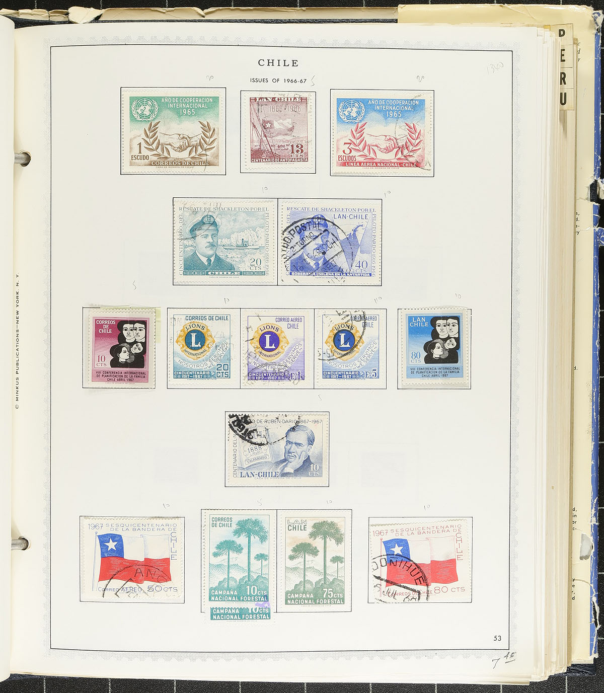 South America - Chile & Peru. An attractive old-time Minkus album, with pages for both countries running from the beginning to the mid-1980's. A mix of both mint and used, many of the mint (especially the later periods) are in mounts, leaving the stamps Never Hinged. The Chile section runs 1862-1985 (#11/693), with 1060 stamps including "back of the book" issues (catalogue US$1348.10). The Peru section runs 1858-1983 (#4/788) with 1017 stamps, including "back of the book" (catalogue US$1125.10). Expect the odd fault, some loose stamps that need placing, and perhaps the odd reprint in the earlier material. That being said, this is an excellent opportunity for any South American collector, with a still usable old-time album as a bonus. Total 2026 Scott US$2,473.20 =