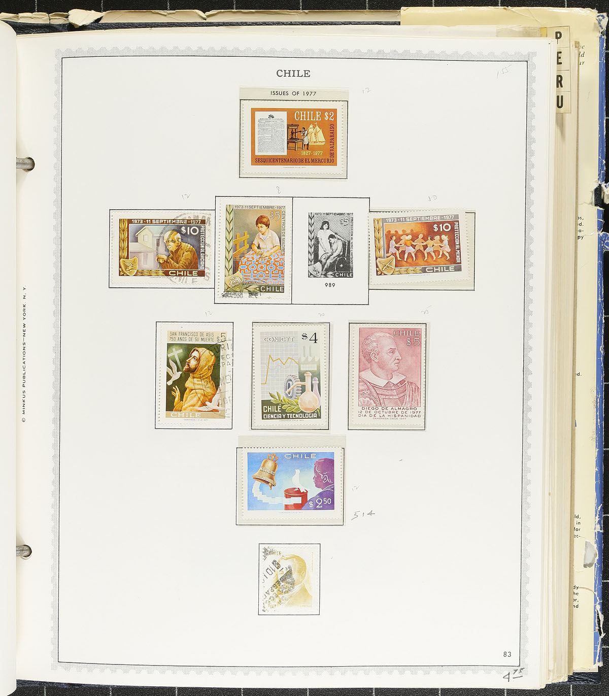 South America - Chile & Peru. An attractive old-time Minkus album, with pages for both countries running from the beginning to the mid-1980's. A mix of both mint and used, many of the mint (especially the later periods) are in mounts, leaving the stamps Never Hinged. The Chile section runs 1862-1985 (#11/693), with 1060 stamps including "back of the book" issues (catalogue US$1348.10). The Peru section runs 1858-1983 (#4/788) with 1017 stamps, including "back of the book" (catalogue US$1125.10). Expect the odd fault, some loose stamps that need placing, and perhaps the odd reprint in the earlier material. That being said, this is an excellent opportunity for any South American collector, with a still usable old-time album as a bonus. Total 2026 Scott US$2,473.20 =