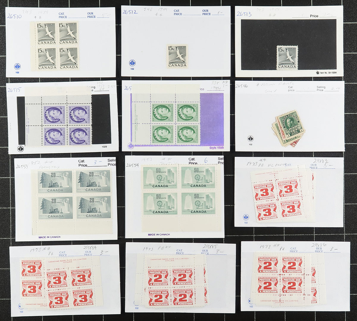 Mint Hinged/Never Hinged holding of singles, blocks, plate blocks and small groups, all assembled in 100x "102" cards. Lots of better items noted, including coils, early issues, "back of the book" and multiples. Well worth the reasonable estimated value. Estimate =