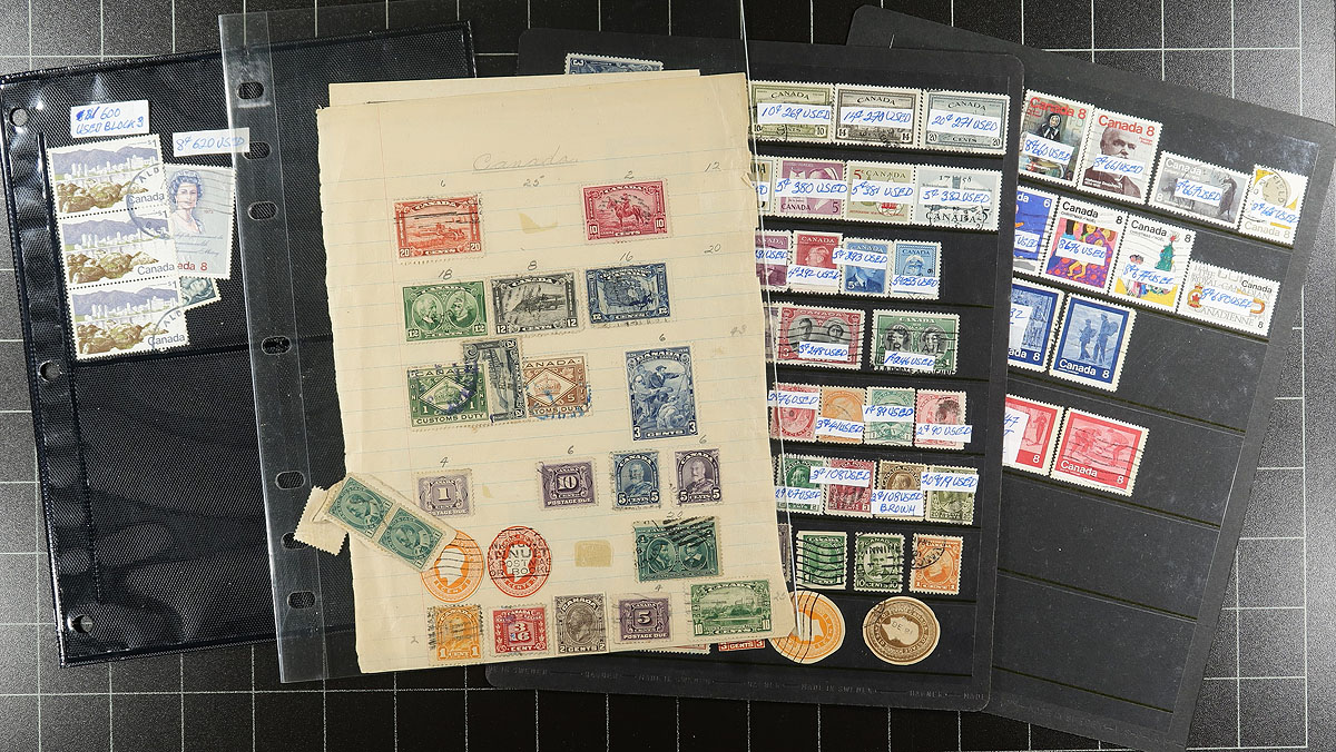 Bankers box of partial collections with wholesale quantities. Mostly used with a good selection of Small Queen’s and not stopping until about 2000, with a touch of material after that. Albums, stock pages, loose pages a couple of little stock books. Thousands upon thousands of stamps, with some cancel potential. Estimate =