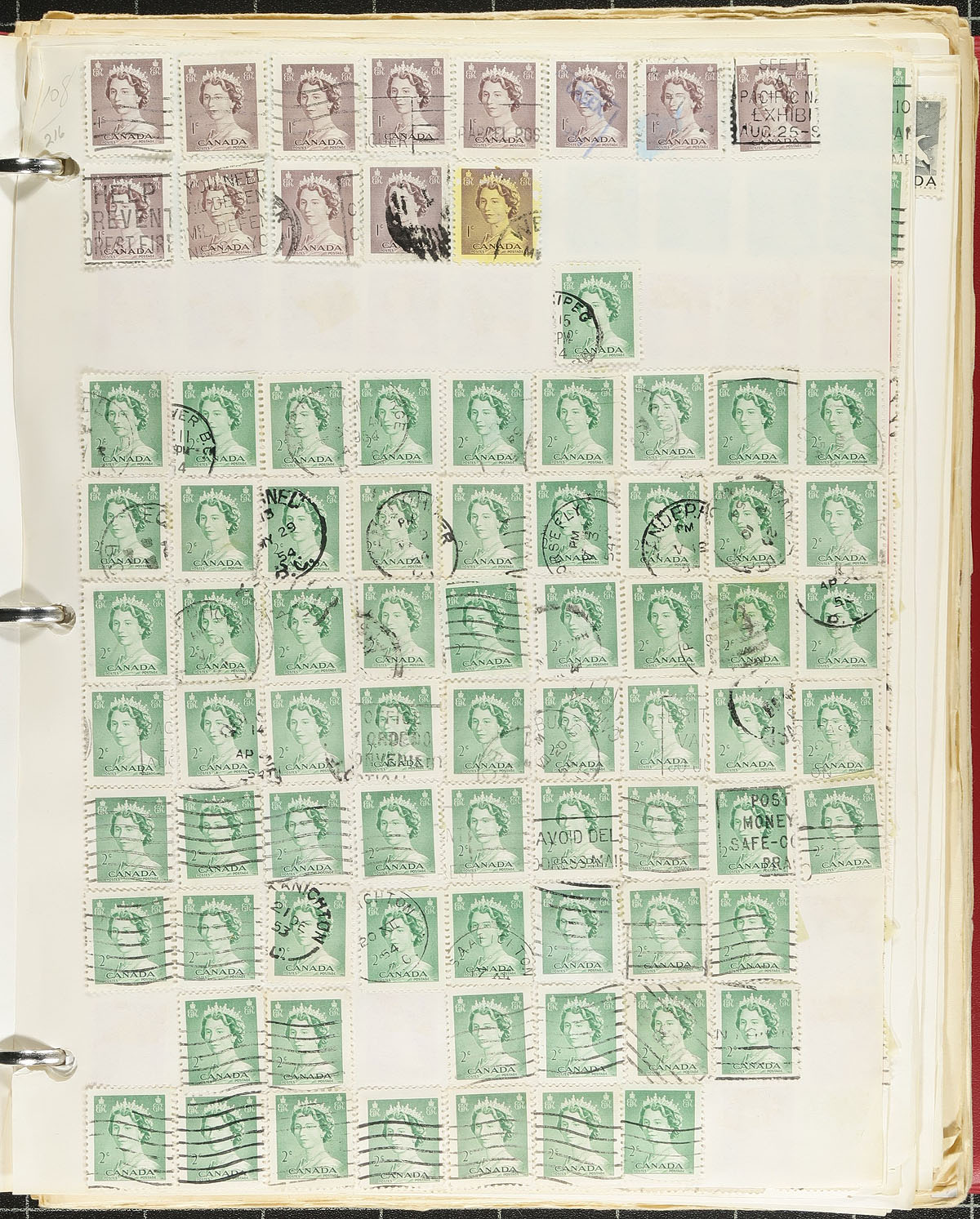 Bankers box of partial collections with wholesale quantities. Mostly used with a good selection of Small Queen’s and not stopping until about 2000, with a touch of material after that. Albums, stock pages, loose pages a couple of little stock books. Thousands upon thousands of stamps, with some cancel potential. Estimate =