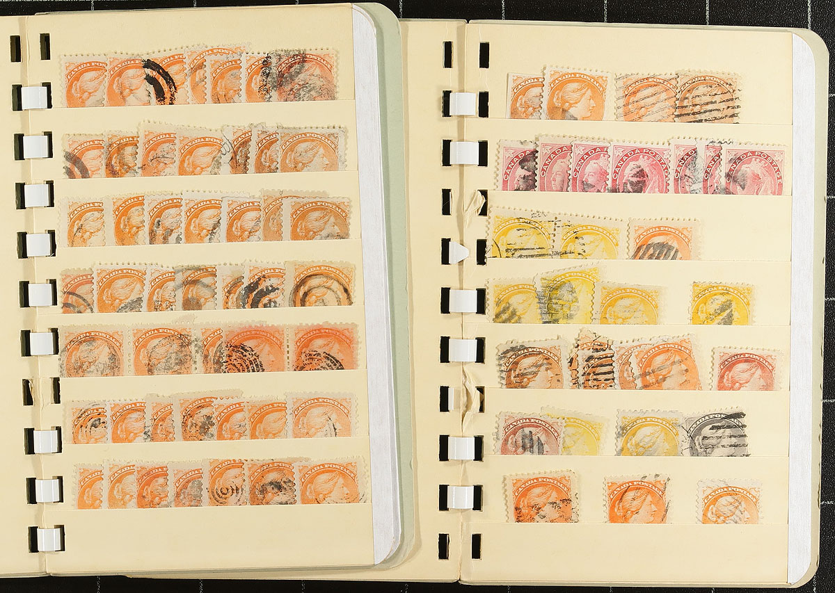 Bankers box of partial collections with wholesale quantities. Mostly used with a good selection of Small Queen’s and not stopping until about 2000, with a touch of material after that. Albums, stock pages, loose pages a couple of little stock books. Thousands upon thousands of stamps, with some cancel potential. Estimate =