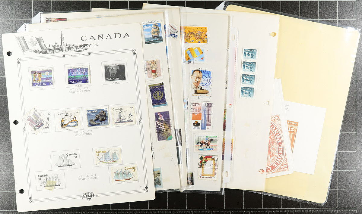 Bankers box of partial collections with wholesale quantities. Mostly used with a good selection of Small Queen’s and not stopping until about 2000, with a touch of material after that. Albums, stock pages, loose pages a couple of little stock books. Thousands upon thousands of stamps, with some cancel potential. Estimate =